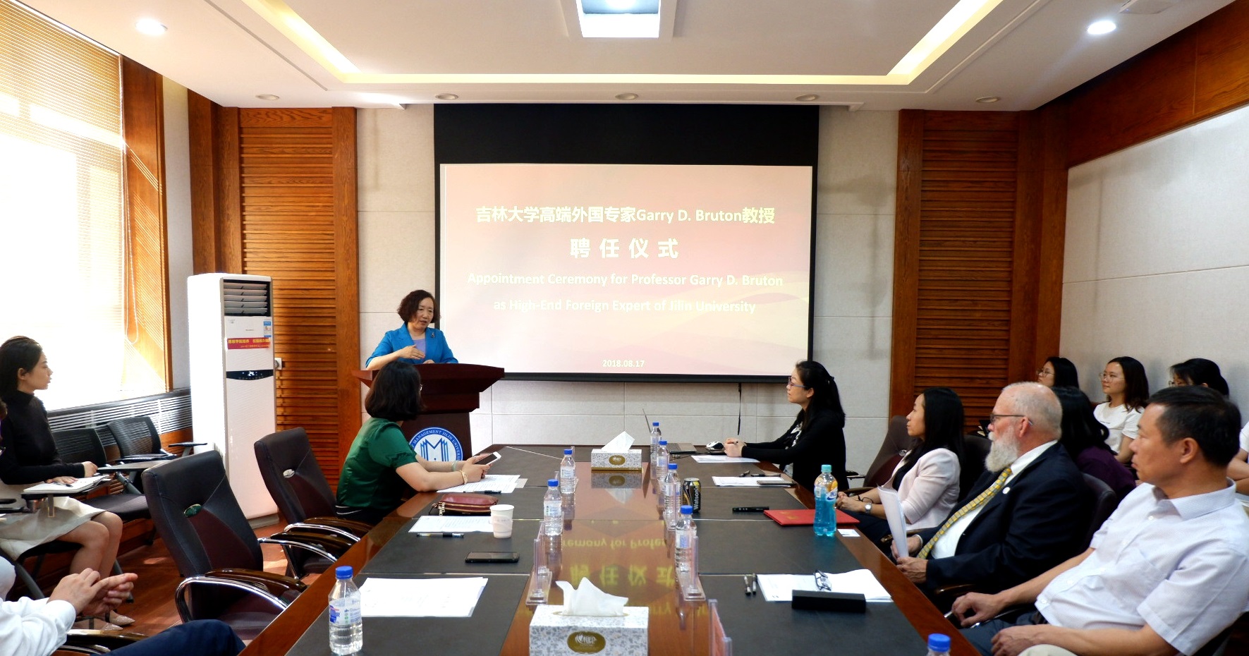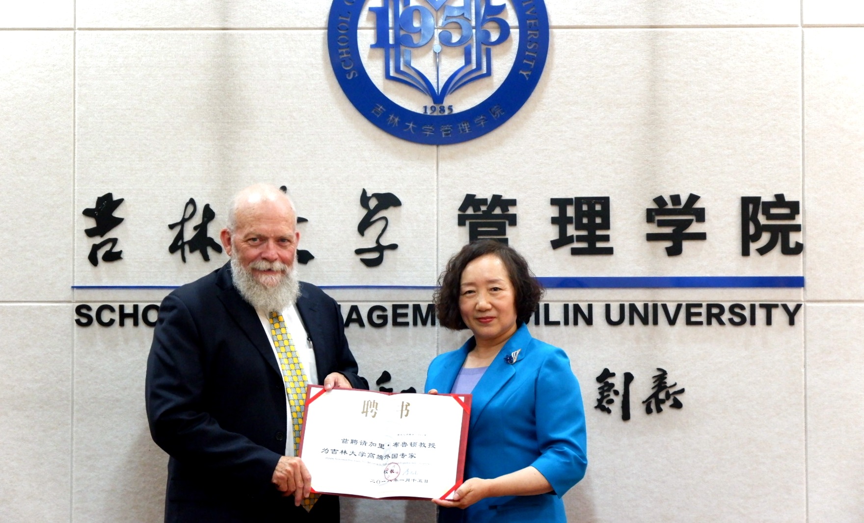 人才办徐昊副主任宣读了学校高端外国专家的聘任决定,校党委常务副书记蔡莉教授向Bruton教授颁发了聘任证书,佩戴学校校徽。