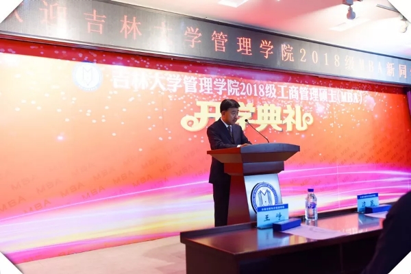 管理学院院长赵树宽教授致欢迎词。他首先代表学院、代表张兴林书记和其他党政领导以及全体师生员工,向新同学表示热烈的欢迎和亲切的问候。他向学生们介绍了学院的发展历程和取得的成绩,同大家重温大学之道,希望同学们在未来的学习时光里,要不断地“求索、拼搏、积累和收获。”