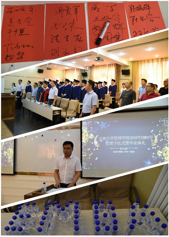 第三项由赵树宽院长为毕业生致辞。首先他代表管理学院向光临本次毕业典礼的各位来宾表示热烈的欢迎,向取得硕士学位的管理学院2013、2014级EMBA学员表示热烈的祝贺。院长在肯定了每位学员的不懈努力,以特有的毅力品质克服了工作及事业方面的诸多困难取得优异成绩的同时,对所有EMBA毕业生与在读学员提出了三点新要求:1、“千年暗室,一灯即明”。 院长希望大家今天毕业于吉大管院EMBA,日后也要养成并保持学习的能力。只有坚持学习才能有助于加快知识更新、优化知识结构、拓宽眼界和视野,从而增强工作的科学性、预见性,在时代浪潮中赢得主动、赢得优势、赢得未来;2、“为学之实,固在践履。苟徒知而不行,诚与不学无异。”院长希望每位管院EMBA毕业生牢记吉大管院EMBA“近贤达、破格局、论恒越之道”的初心,将所学到的知识和才华无私地奉献给国家的富强与民族的振兴事业,做到一个真正具有工匠精神的企业家。3.心系母校。“既入管院门,终为吉大人”希望每个人律己隆法,修身明德,不辱使命,不负重托。