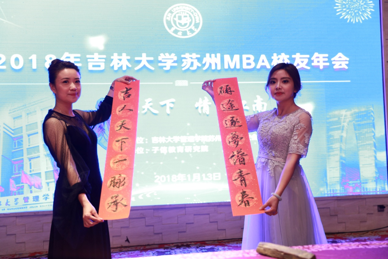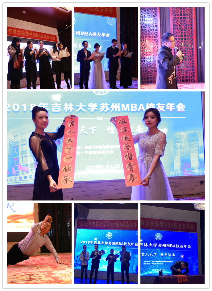 随后,校友现场书墨“吉人天下一脉承、研途逐梦谱青春”,书写了我们为了梦想,一起拼搏的心声,缘由吉大、情系江南!还有时尚靓丽的现代舞、衣袂飘飘的优雅古典舞,小清新的《小幸运》,全场爆笑的《百家笑谈》,时间流逝的《童年》,沉静质朴的《从前慢》,礼品多多的抽奖环节,娱乐互动的游戏环节……欢声笑语犹在耳旁,喜颜欢笑犹在眼前,一历历,一幕幕,这是属于我们的美好回忆,挥手2017,携手2018!