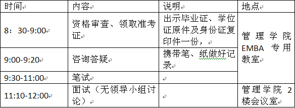 您好!欢迎报考探花 管理学院高级管理人员工商管理硕士(EMBA)项目。经初步资格审查,您已获得参加2015年探花 管理学院高级管理人员工商管理硕士(EMBA)项目入学考试资格。入学考试将于2015年12月12日举行,现就考试安排作如下通知: