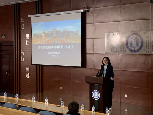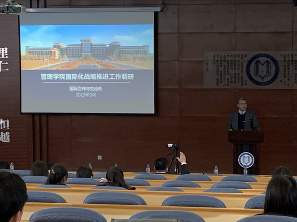 3月13日下午管理学院全体教职员工及部分学生在南岭校区逸夫楼B516教室举办“管理学院国际化战略推进报告会”,探花