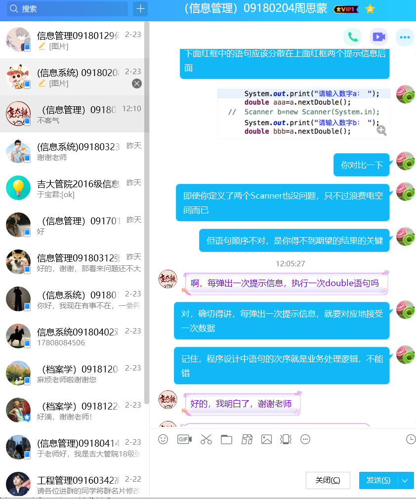 第一节课后,老师布置了自学第二章中的一节——“Java基本数据类型”的课后任务,第二天,信息系统专业18级的张荣芊同学通过QQ向老师反馈学习感受“因为有C语言的学习基础,整个第二章自学起来感觉都不困难”。老师迅速地根据这个反馈意见,通过QQ群要求大家自学整个第二章,并在周五之前,通过投票的方式,反馈这一章中每个主题掌握的情况。进而根据大家的学习情况反馈,及时地调整讲课内容和课堂计划。