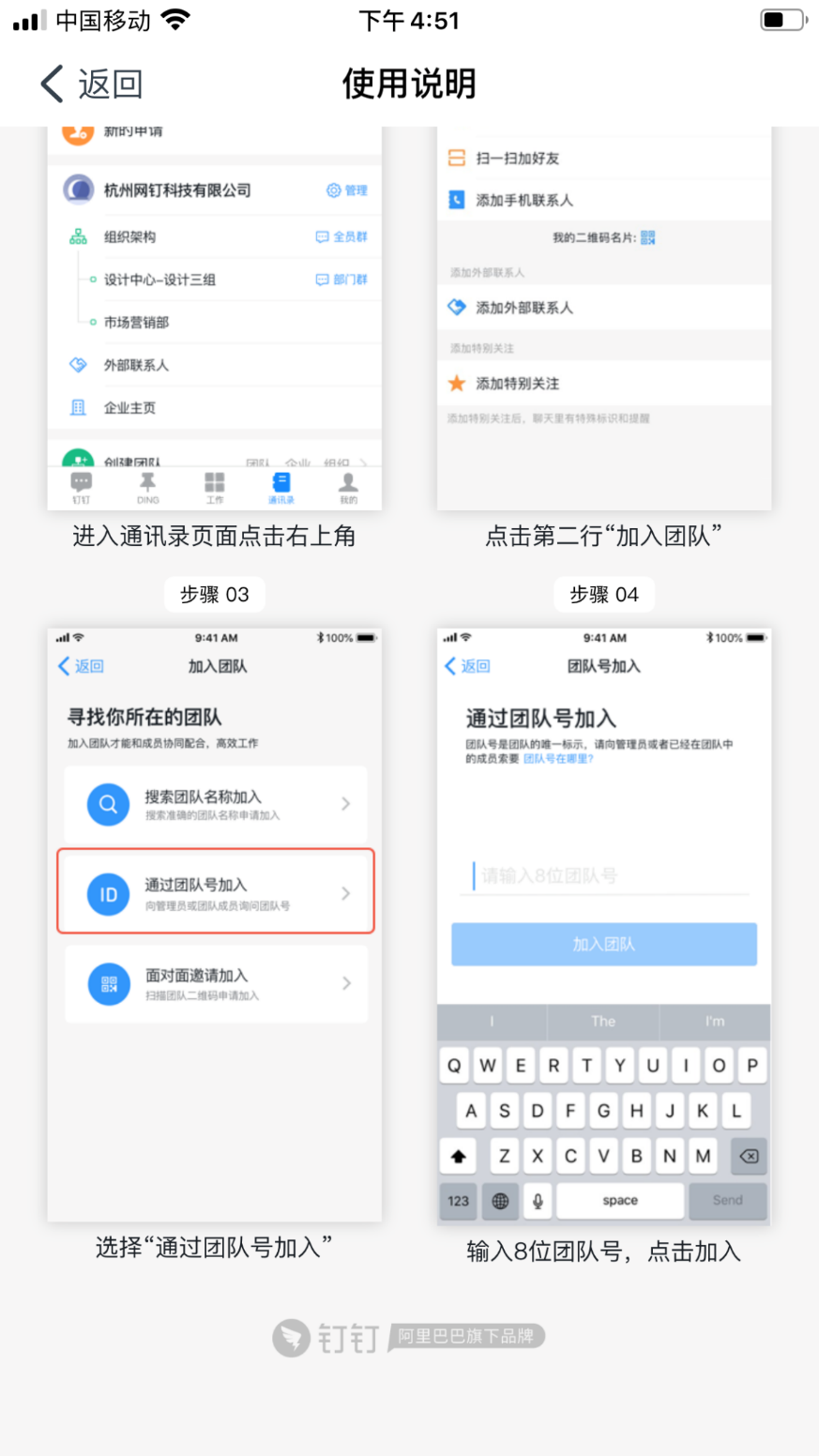 下载 “钉钉”,首先需要加入到课程班中,本课程班的团队号为: PBXE3231。团队名称:探花