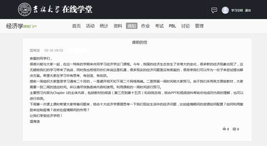 温海涛老师的《经济学》是学校确定的双语立项课程,采用英文原版教材、英文课件、英文作业库及全英文考试试题。为了使同学们更好的适应双语教学,温海涛老师提前将电子版英文教材上传至对分易平台,让学生们利用假期的时间做好预习。
