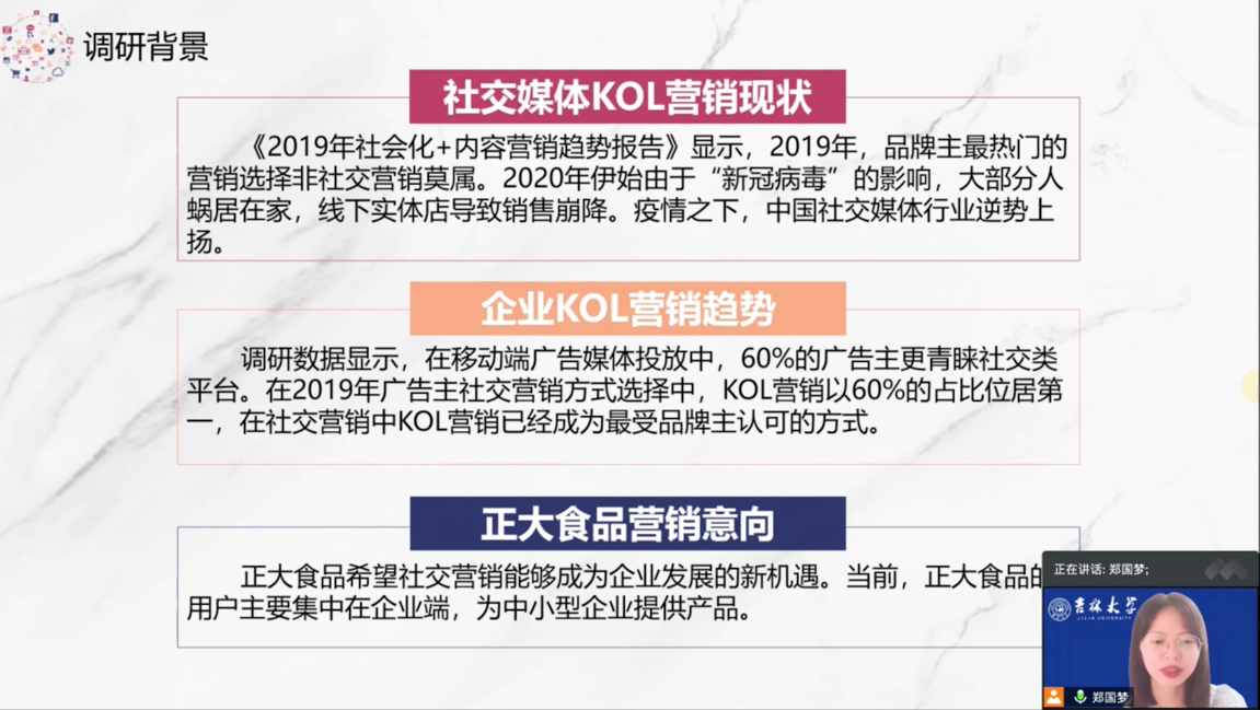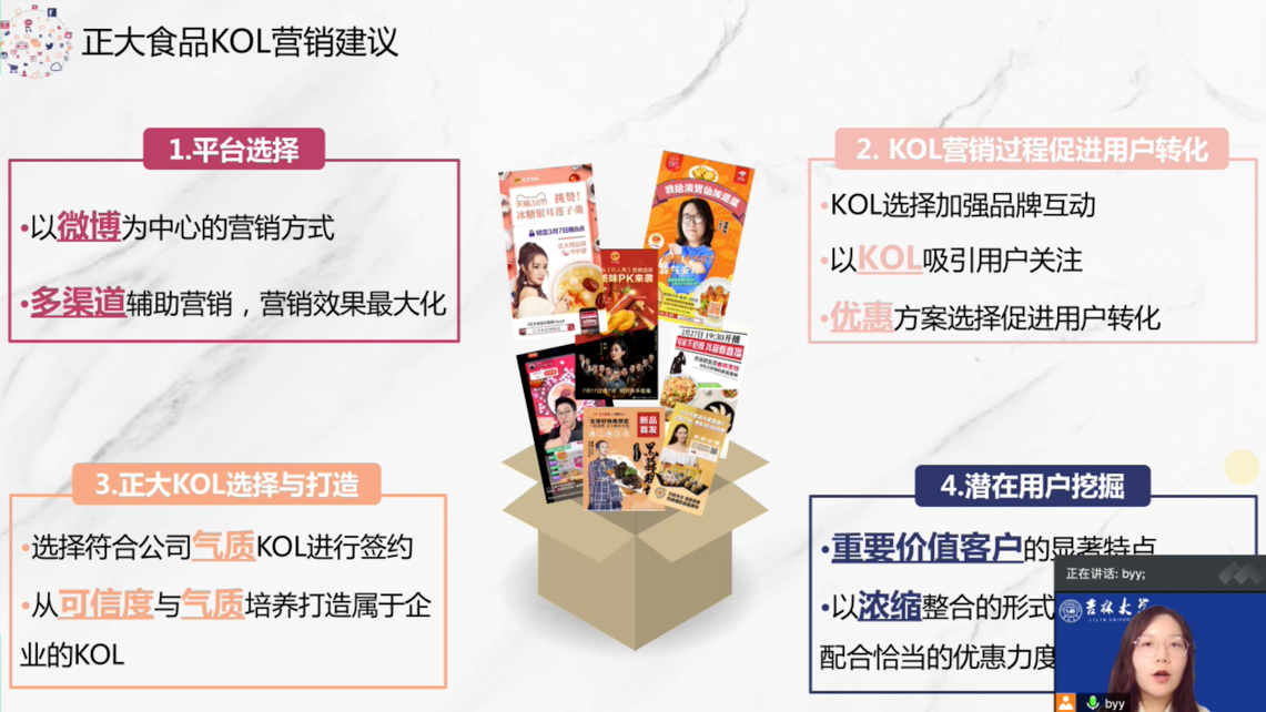 代表队,由管理学院王晰巍教授作为指导老师带领的2017级管理学院本科生郑国梦、陶冰心和毕樱瑛3名同学共同完成的《如何在直播带货中“C位”出道——正大食品Influencer Marketing的KOL用户行为及营销调查研究》作品,通过网赛、校赛、省赛和国赛的层层选拔,荣获全国总决赛国家级一等奖,这也是探花