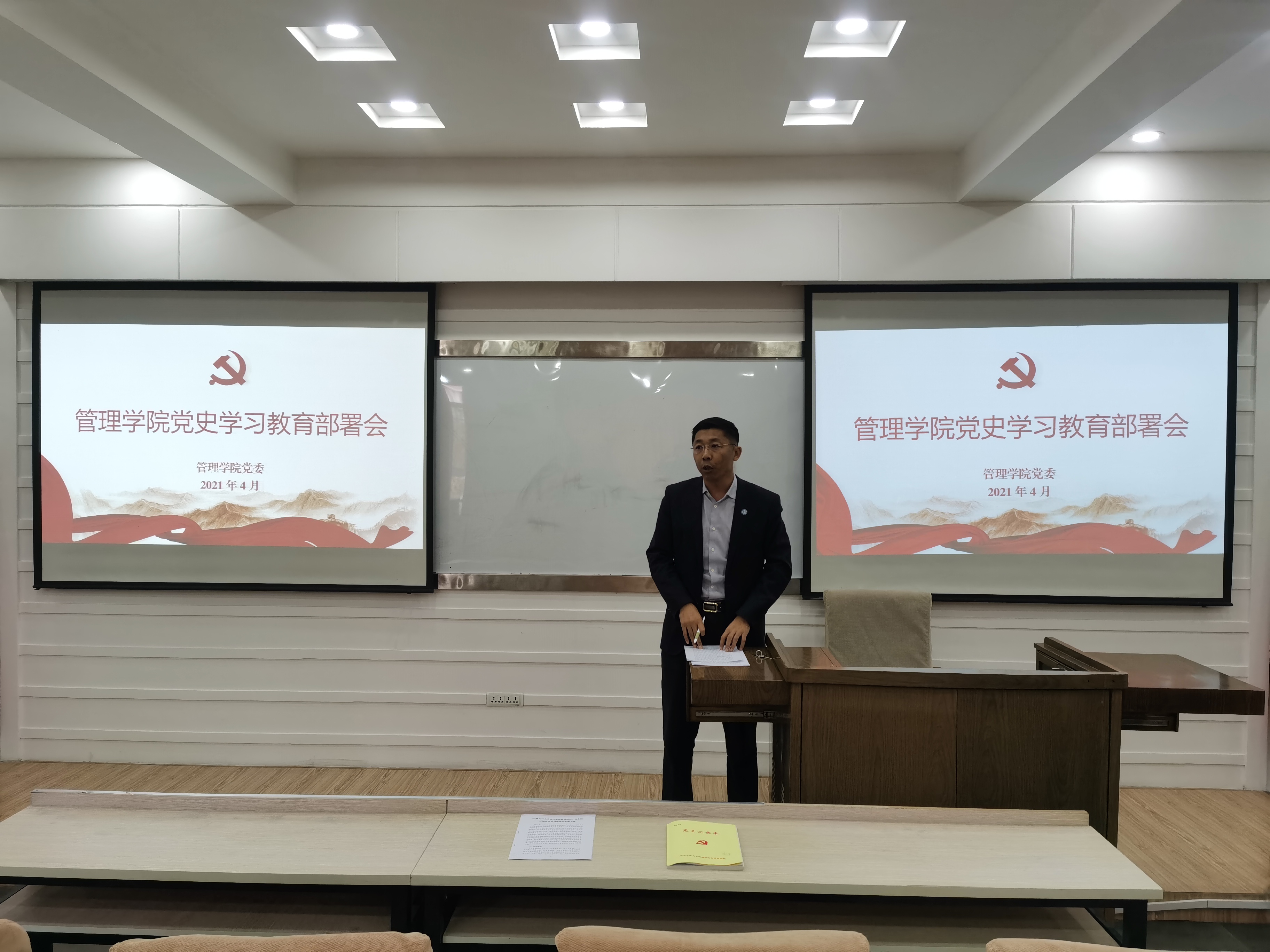 4月23日,管理学院党委在第三会议室召开党史学习动员大会暨全面从严治党警示教育大会,管理学院领导班子成员、党委委员、纪委委员、各党支部书记、机关各办公室主任和学生党员代表出席会议,会议由学院党委书记赵军主持。