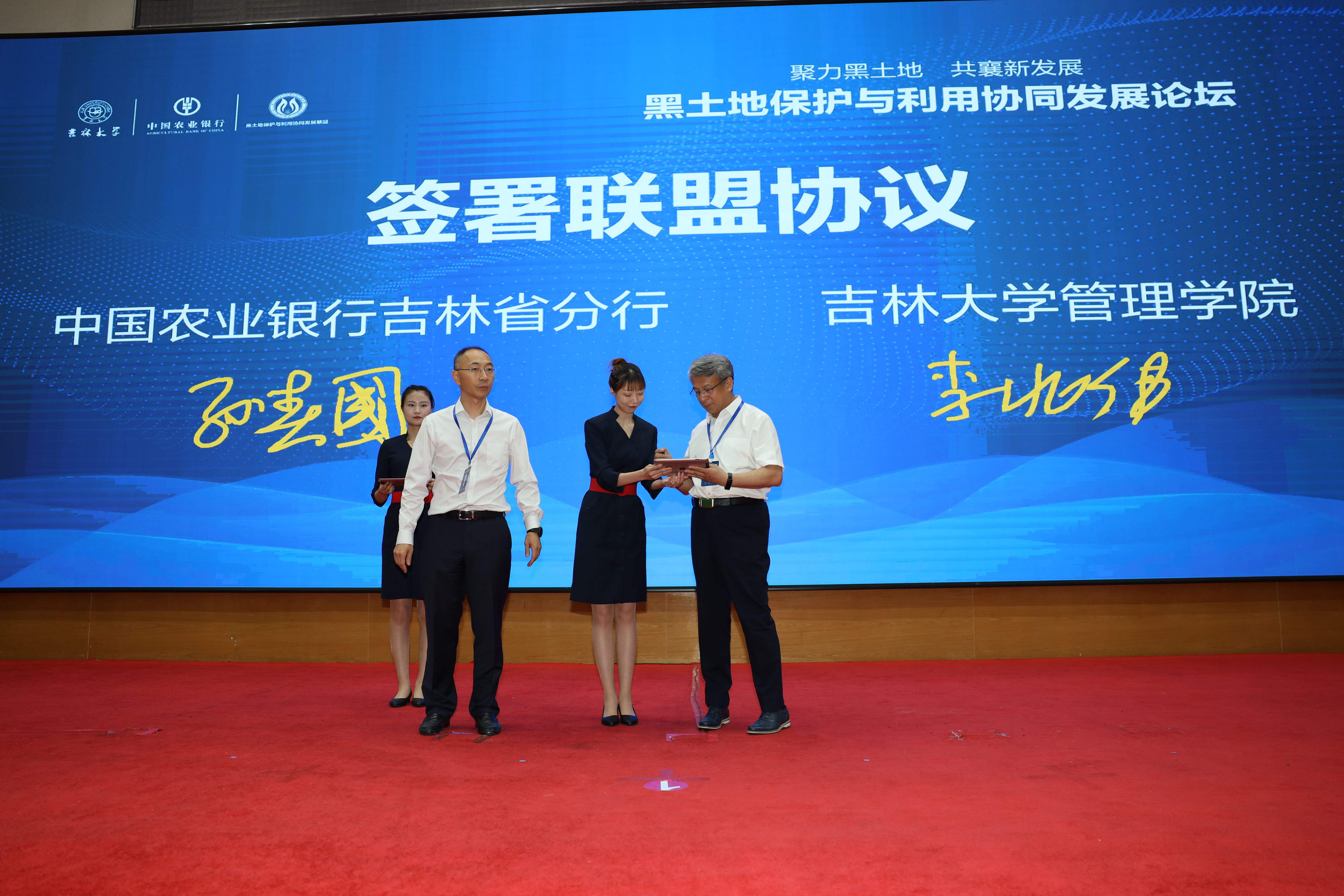 管理学院院长李北伟与中国农业银行吉林省分行党委委员、副行长孙春国作为联盟发起单位代表签署联盟协议。中国科学院东北地理与农业生态研究所党委书记苏阳,吉林省农业农村厅副厅长夏季等共同为“黑土地保护与利用协同发展联盟”揭牌。中国农业银行吉林省分行党委委员、副行长秦翰介绍“黑土粮仓贷”。探花
