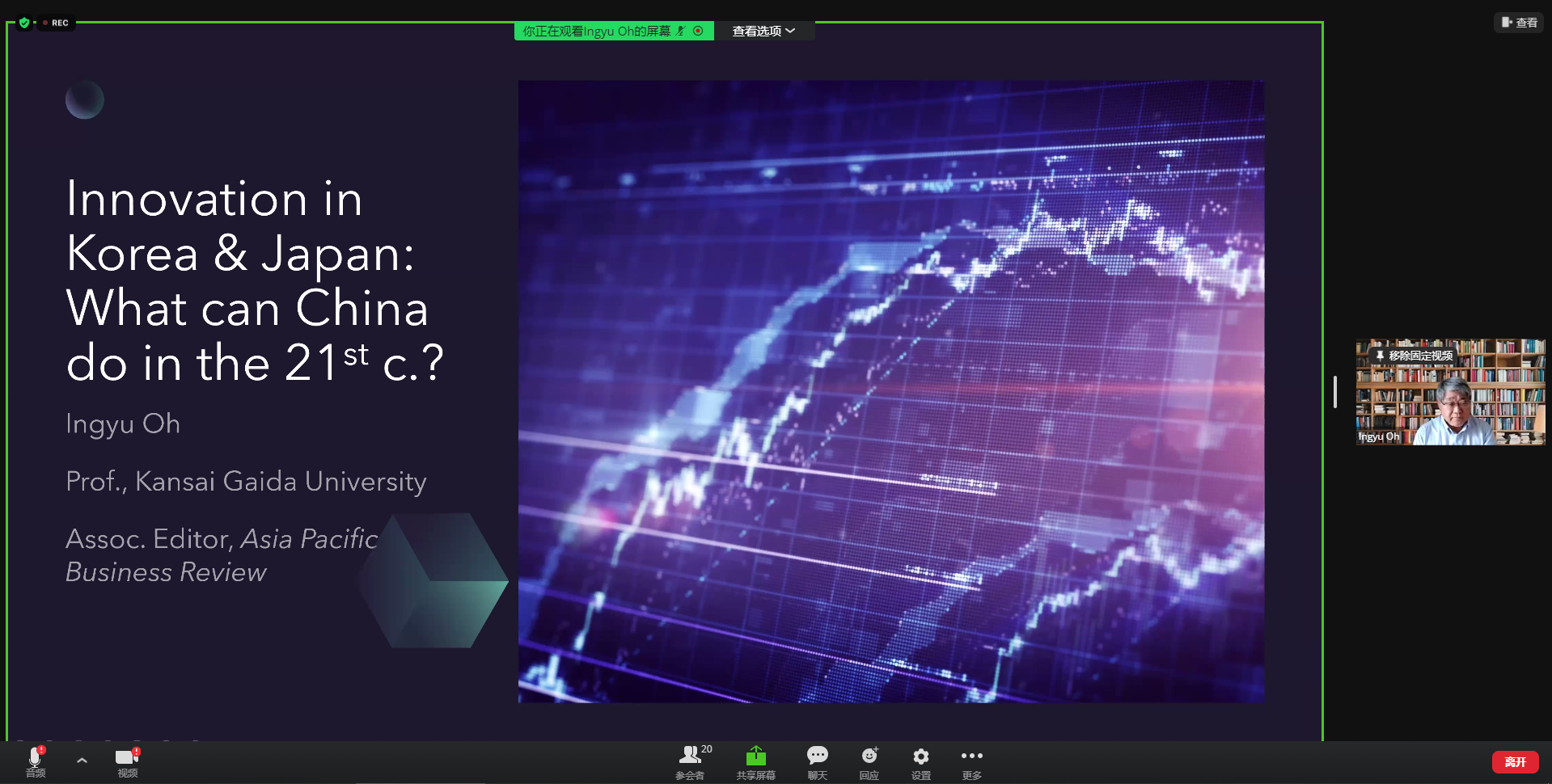 随着中国企业在创新方面的活力被激发,如何吸收国外的先进经验,走出符合中国国情的创新路径已成为研究热点。为启发学院师生对中国在创新方面与其他国家的差异及改进路线进行深度剖析和思考,2021年9月20日下午13:30,管理学院成功邀请日本关西外国语大学Ingyu Oh教授为我校师生作题为《Innovation in Korea and Japan: What can China do in the 21st century?》的学术报告,报告采取线上形式,由技术经济及管理系单标安副教授主持此次学术报告。