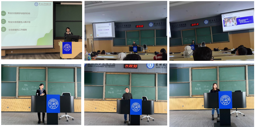 11月10日下午,管理学院2020级本科生专业分流宣讲大会在南岭校区逸夫楼511教室和516教室同时进行。管理学院教学副院长马捷向同学们解读了《管理学院2020级学生专业方向分流工作实施细则》,强调了分流工作尊重意愿与成绩择优相结合、公平公正与公开透明相结合等工作原则。信息管理与信息系统、大数据管理与应用专业的马捷、于宝君老师、物流管理专业的姚舜老师、工程管理专业的王东老师、工商管理专业的杨红、郭润萍老师、会计学专业的孟庆顺、满媛媛老师、市场营销和人力资源管理专业的古安伟老师进行了详细的专业介绍,两个会场近400名同学认真听取老师讲解,管理学院学生办公室、教务办公室的工作人员在宣讲现场为同学们服务。