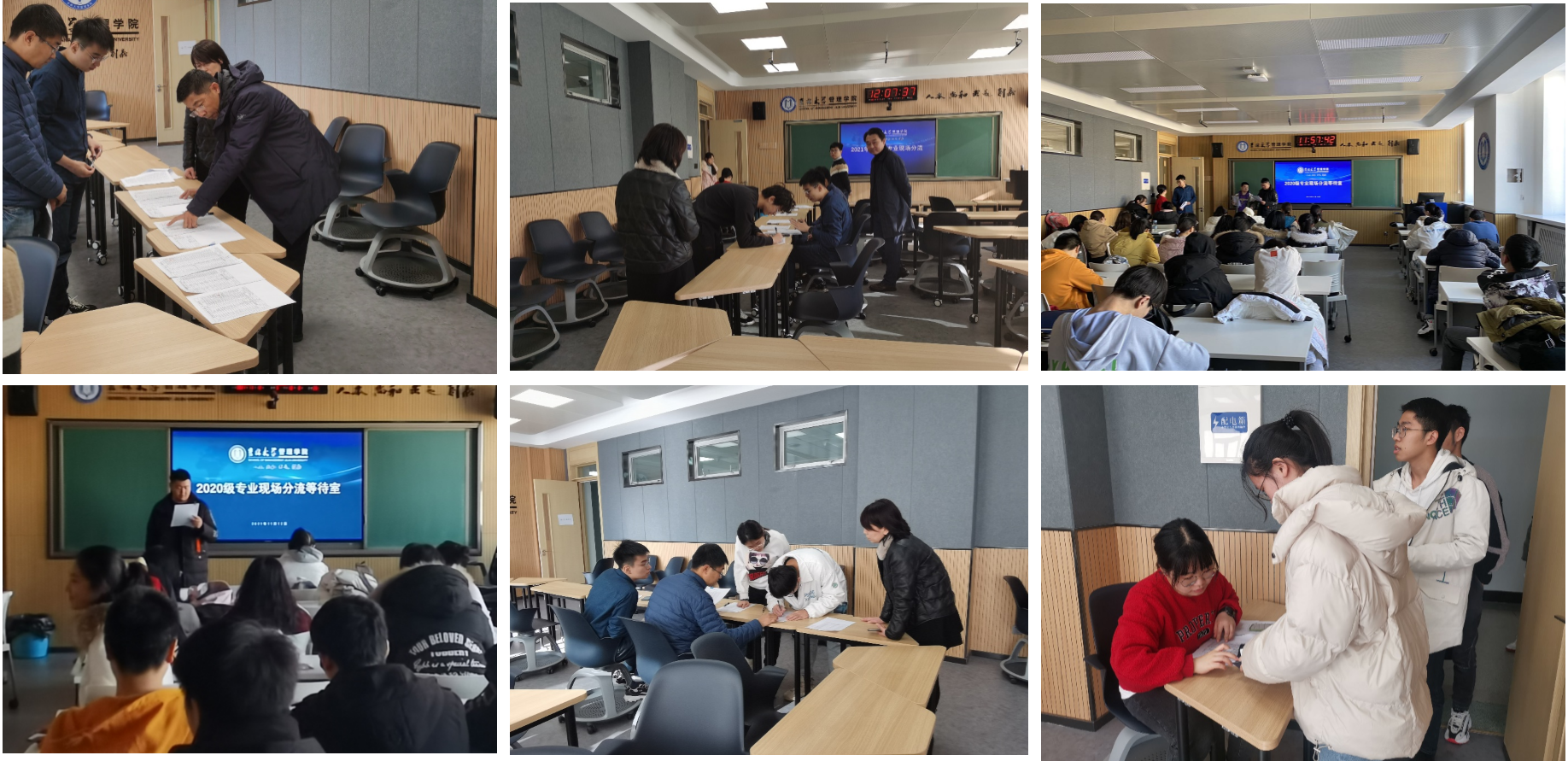 11月12日下午,管理学院2020级本科生现场专业分流工作在南岭校区逸夫楼518、517和515教室有序进行。管理学院党委书记赵军、教学副院长马捷、纪检委员景涛、学院教务办张洪铭、郑宇琦、本科生辅导员梁玉芳、李毓、本科生辅导员助理张家高、王志恒及2020级管科大类和工商大类本科生参加了现场分流工作。两个大类的学生按照成绩排序依次进行现场专业选择,并签名确认。经过近4个小时的有序工作,380名同学按照工作规范和流程完成了专业选择。管理学院教务办当天在学院网站公示了专业分流结果。