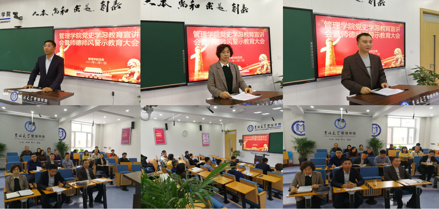 为学习贯彻党的十九届六中全会精神,全面落实高校立德树人的根本任务,管理学院于11月17日召开党史学习教育宣讲会暨师德师风警示教育大会,学院全体教职工、部分学生党员出席会议,会议由党委书记赵军同志主持。