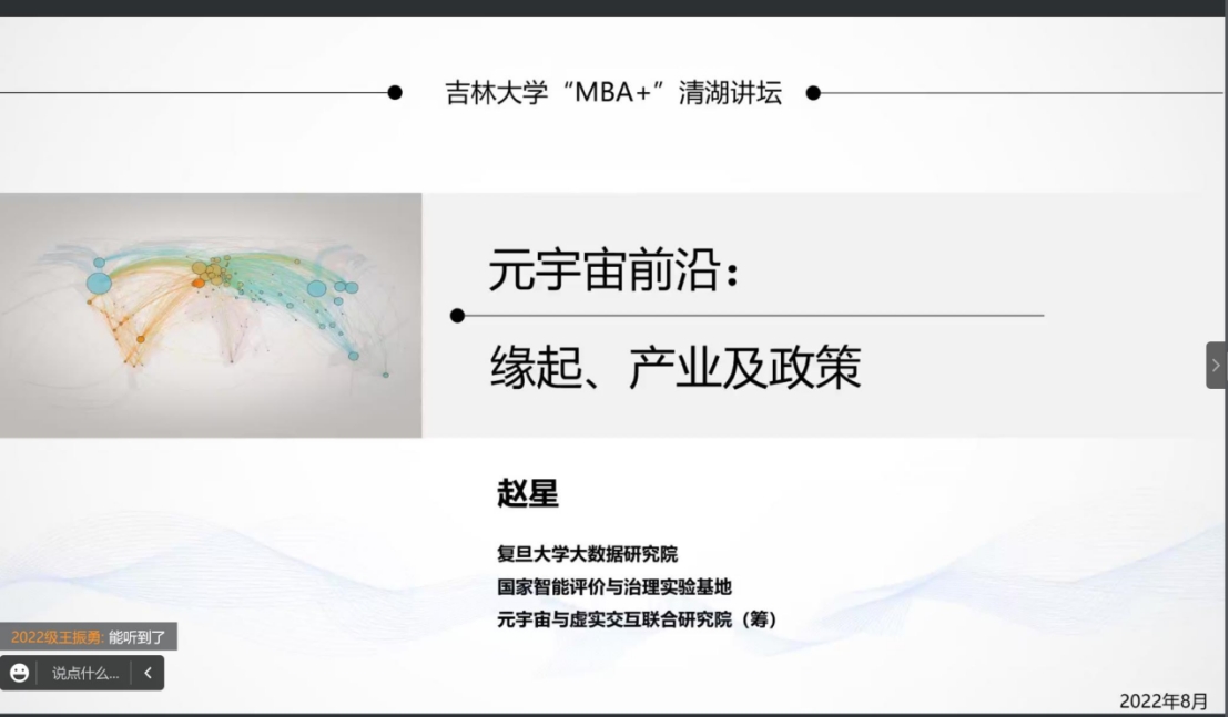 8月14日晚,清湖讲坛第二讲如期在云端举办。中心邀请复旦大学大数据研究院博士生导师赵星教授做题为《元宇宙前沿:缘起、产业与中国模式》专题讲座。本次活动由MBA教育中心主任兼探花