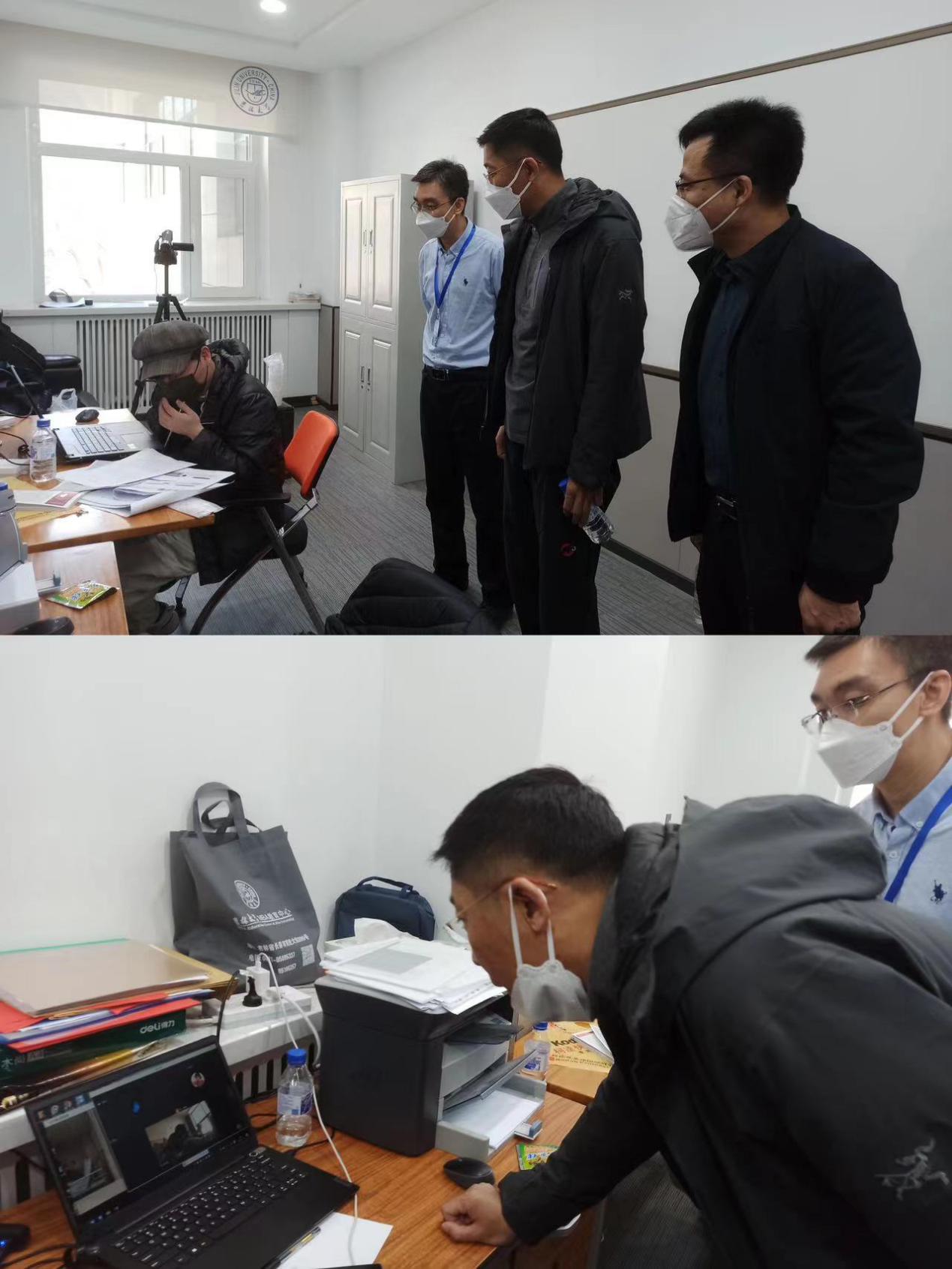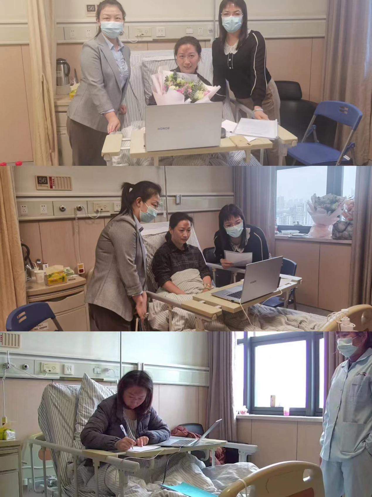 在得知考生宣某某近日发生车祸,目前正在住院的情况后,中心积极帮助宣柯妤协调解决问题,单独为其开设线上考场,在护士的帮助下,通过双机位进行线上复试,顺利完成复试笔试及面试。中心副主任张越及教学管理办公室主任林晶赴医院看望考生,并协助她完成面试环节。