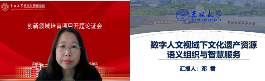 信息管理系主任邓君教授介绍了创新领域培育计划项目“数字人文视域下文化遗产资源语义组织与智慧服务”的宏观、中观、微观研究背景,围绕学术、应用和社会三个层面阐明项目的研究价值,指出该项目对于学院和学科发展的关系和贡献,从理论体系、技术路径、服务体系及场域实证四个维度出发,系统化解构研究框架和总体目标。邓君教授认为,基于数字人文相关理论、数智技术与方法,可以实现细粒度的文化遗产资源语义组织,为后续语义检索、可视化呈现等提供底层数据支持,实现文化遗产的开发式保护以及跨时空传承。