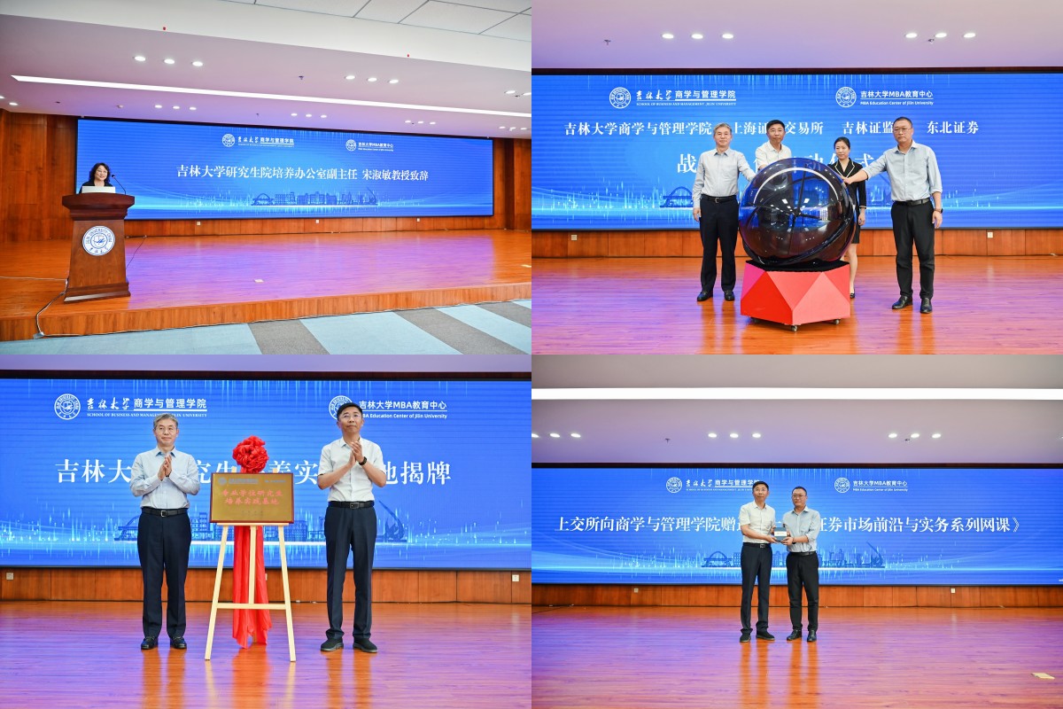 党委书记赵军、东北证券总裁何俊岩共同为研究生培养实践基地揭牌。上交所投资者服务部资深经理周翀向学院赠送《大学生证券市场前沿与实务系列网课》。