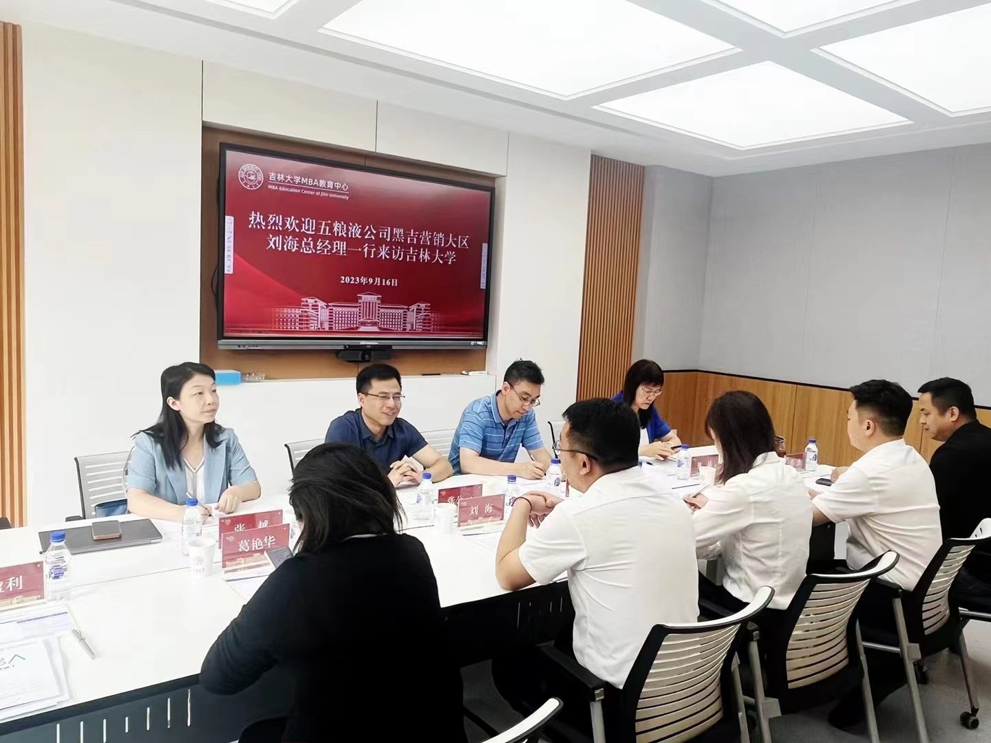 MBA教育中心,就优秀学生支持计划、案例研发、科技创新与探花等议题开展座谈交流。五粮液集团黑吉营销大区总经理刘海、吉林营销总经理王艺璇、人事经理郭盈利、团购经理肖磊、千和酒业董事长葛艳华、总经理裴杰、探花