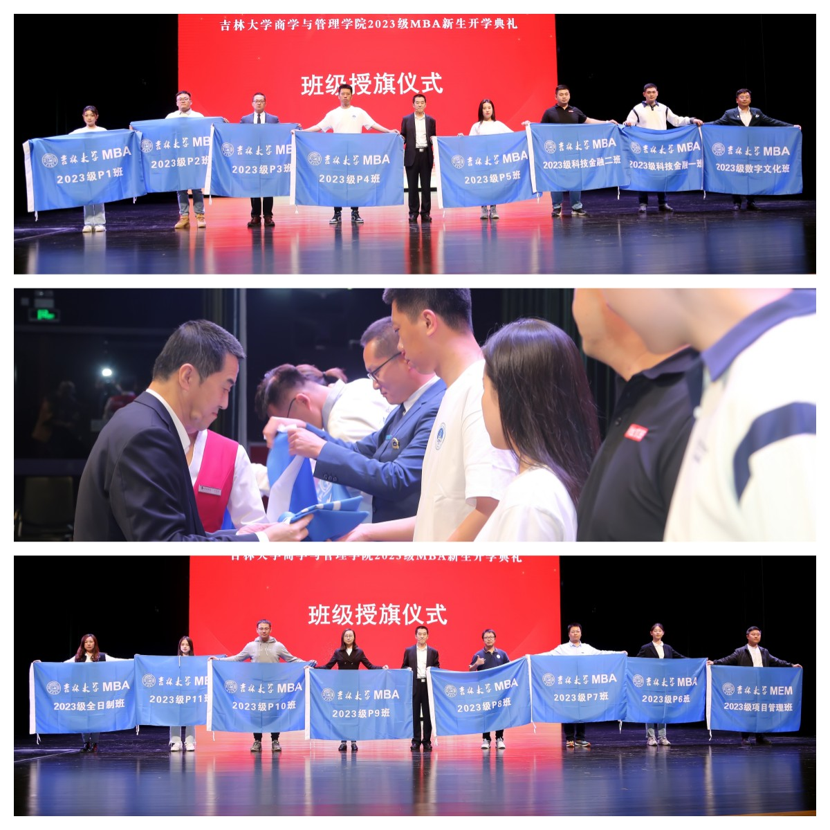 常务副院长张世伟教授为2023级MBA新生班级代表授班旗。每一面“吉大蓝”的班旗不仅蕴含着吉大MBA的文化内涵与精神面貌,更承载着学院对各位莘莘学子的殷切期盼。希望各位同学竖起团结进取、求实创新、励志图强的旗帜,不负芳华,踔厉奋发、勇毅前行!