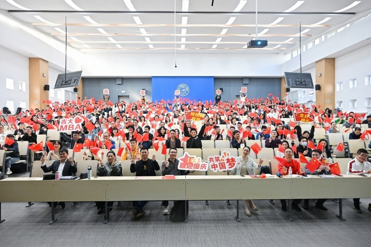 活动在同学们慷慨激昂的迸发中达到高潮:“吉大MBA祝祖国母亲生日快乐,我爱您中国!”这正是千言万语汇成一句情——今天为振兴中华而勤奋学习,明天为创造祖国辉煌贡献力量!这也是吉大MBA学生思政的一次具体实践。