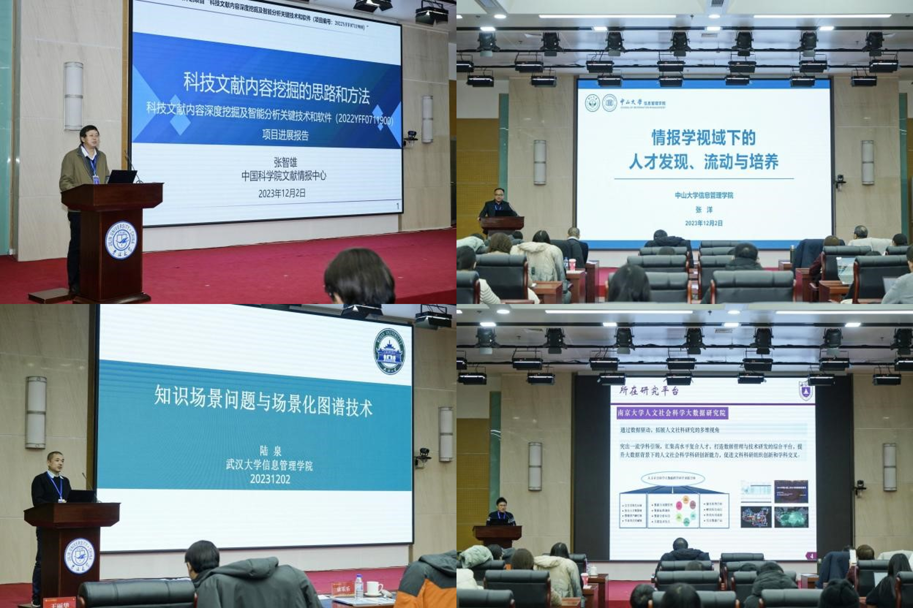 主题报告阶段,共有13位专家学者奉献了精彩的学术报告。中国科学院文献情报中心副主任、国家重点研发计划项目负责人和国家社科基金重大项目首席专家张智雄教授,中山大学信息资源管理学院院长、大数据研究院院长张洋教授,武汉大学信息管理学院信息管理科学系主任陆泉教授,南京大学信息管理学院信息管理科学系主任、国家级人才康乐乐教授,辽宁大学信息资源管理学院院长、国家级档案专家赵彦昌教授,北京大学信息管理系黄文彬教授、上海大学文化遗产与信息管理学院副院长王丽华教授,上海大学文化遗产与信息管理学院国家级档案专家周林兴教授,黑龙江大学信息管理学院副院长任越教授,南京理工大学经济管理学院朱鹏教授,中科院文献情报中心知识系统部刘熠高级工程师,探花