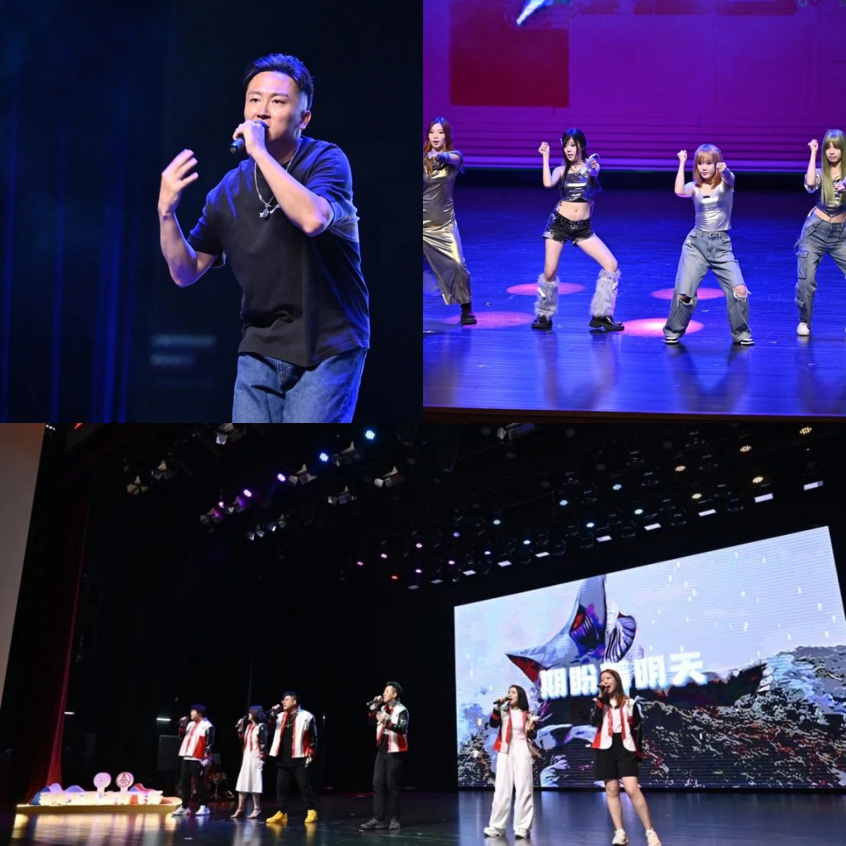晚会的序幕以如风官方乐队的《泸沽湖》及《听见下雨的声音》等四首曲目燃炸开场,分别为我们描绘了远方、青春、理想与爱情的四幅画卷。精彩的开场演出之后,首先映入眼帘的是2024级刘俊辰与2022级王萌的《墨舞云裳》,墨色深邃,琴弦轻吟,引领观众穿越至一场跨越时空的音乐奇缘,古典与爵士的完美交融,编织出一幅幅如梦如幻的画卷。紧接着,2023级孙志煊以一曲《了表心意》触动人心,而特邀嘉宾茶啊冲暖茶时光人声乐团演绎的阿卡贝拉《致青春》,则让每个人的心灵都沉浸在那段衣袂飘飘、纯白无瑕的青春记忆之中。2022级MBA王子璇的《月牙湾》温柔响起,让我们的心悸动在那浅浅的月牙湾之上;随后2023级高语笛以《借过一下》继续点燃现场的气氛,它不仅仅是一首歌曲、更像是一段心灵的独白,让观众们在旋律的起伏中找寻自己的影子,回味那些生命中错过的风景和温柔的擦肩。