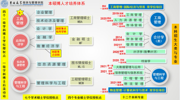 构建了独具特色、符合社会经济发展需求的完备学科专业和本硕博人才培养体系,现设有四个一级学科博士学位授权点和博士后流动站、十一个学硕和专硕学位授权点、十二个本科专业,其中含两个双学士学位复合型人才培养项目。工商管理学科在教育部学科评估中获评A-,九个本科专业获批国家一流或省一流本科专业建设点。