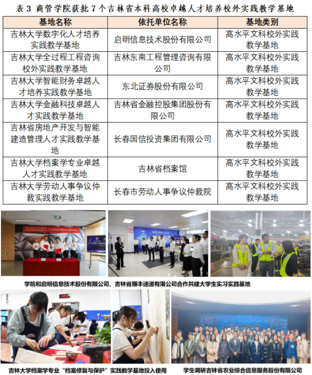 学院重视实践教学,获批7个吉林省本科高校卓越人才培养校外实践教学基地。各专业在带领学生实习实践过程中,注意了解和学习实习基地企业在进行数字化转型升级、数智化改革实践、商业模式创新等方面的举措,结合行业导师的讲解,与学业理论知识相融合,进行创新创业教育。