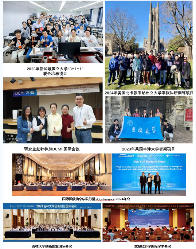 国际交流与合作是学院的重要发展战略。为了培养具有国际视野的创新型人才,学院积极开发本科生国际交流项目,目前与新加坡国立大学合作“3+1+1”本硕贯通人才培养项目;与美国肯塔基大学和匹兹堡大学建立了互惠合作友好关系,持续推进在会计、财务、营销、人力资源、大数据管理与应用、信息管理与信息系统等专业开展“2+2”“3+2”等合作项目。学院积极营造办学的国际化氛围,每年主办“数量经济学国际学术会议”,每两年举办一次“创新创业国际学术会议”,并于2024年成功举办了国际顶级信息学院联盟iSchools的学术年会iConference 2024,这不仅极大地拓宽了学生视野,也推动了学院办学向国际前沿看齐,有效引导和规范了学院的办学模式。