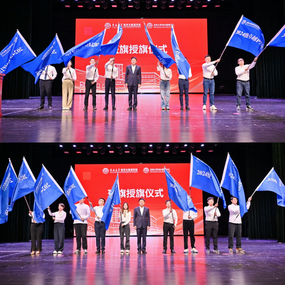 丰硕老师为2024级新生班级代表授班旗。班旗舞动,象征着商管使命的代代传承。