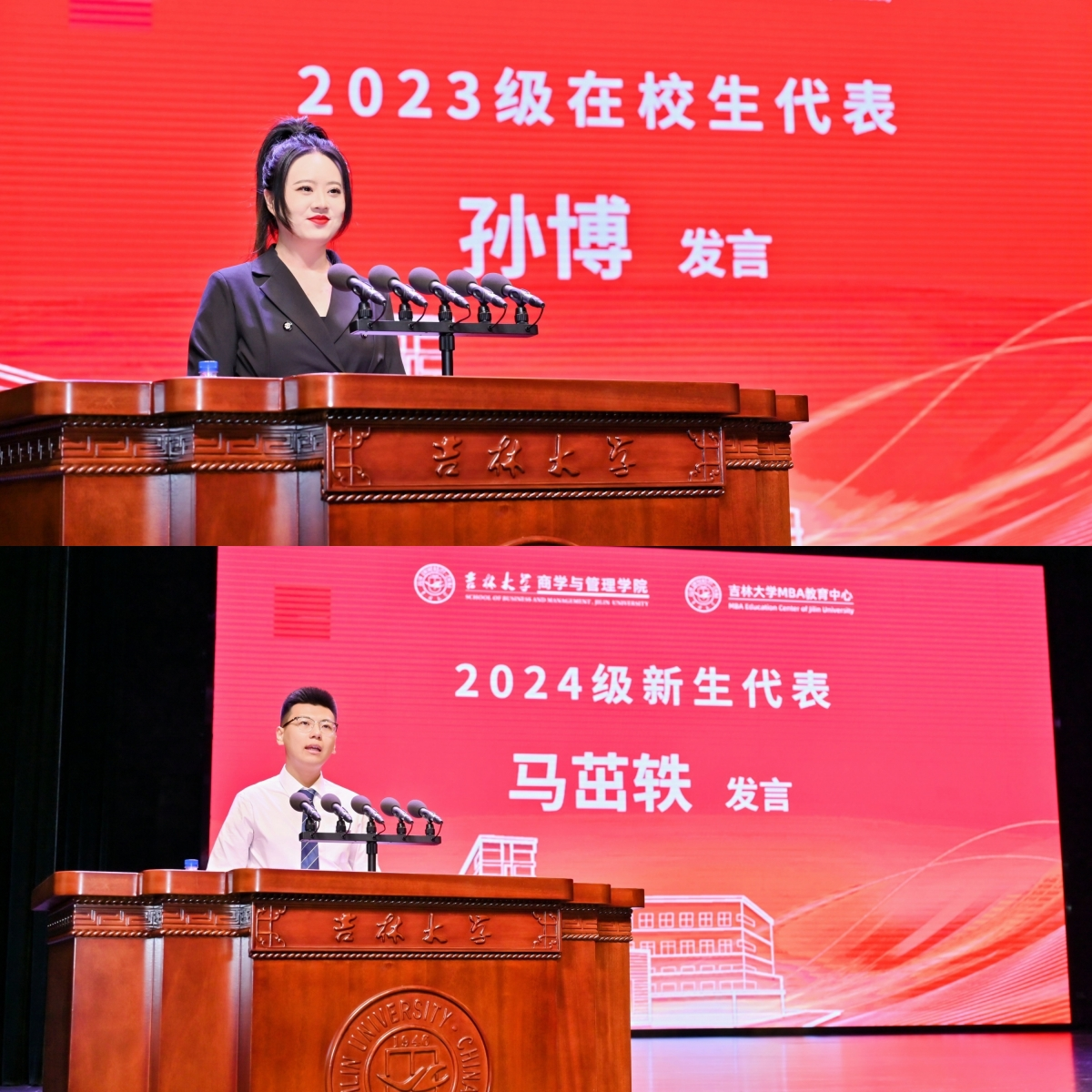 在校生代表2023级MBA孙博,新生代表2024级MBA马茁轶依次上台发言。