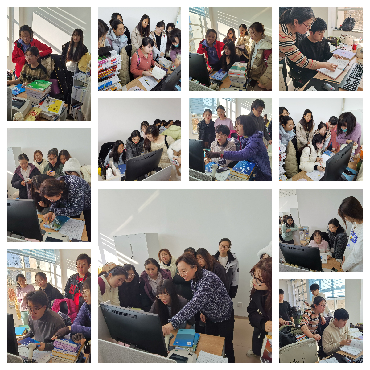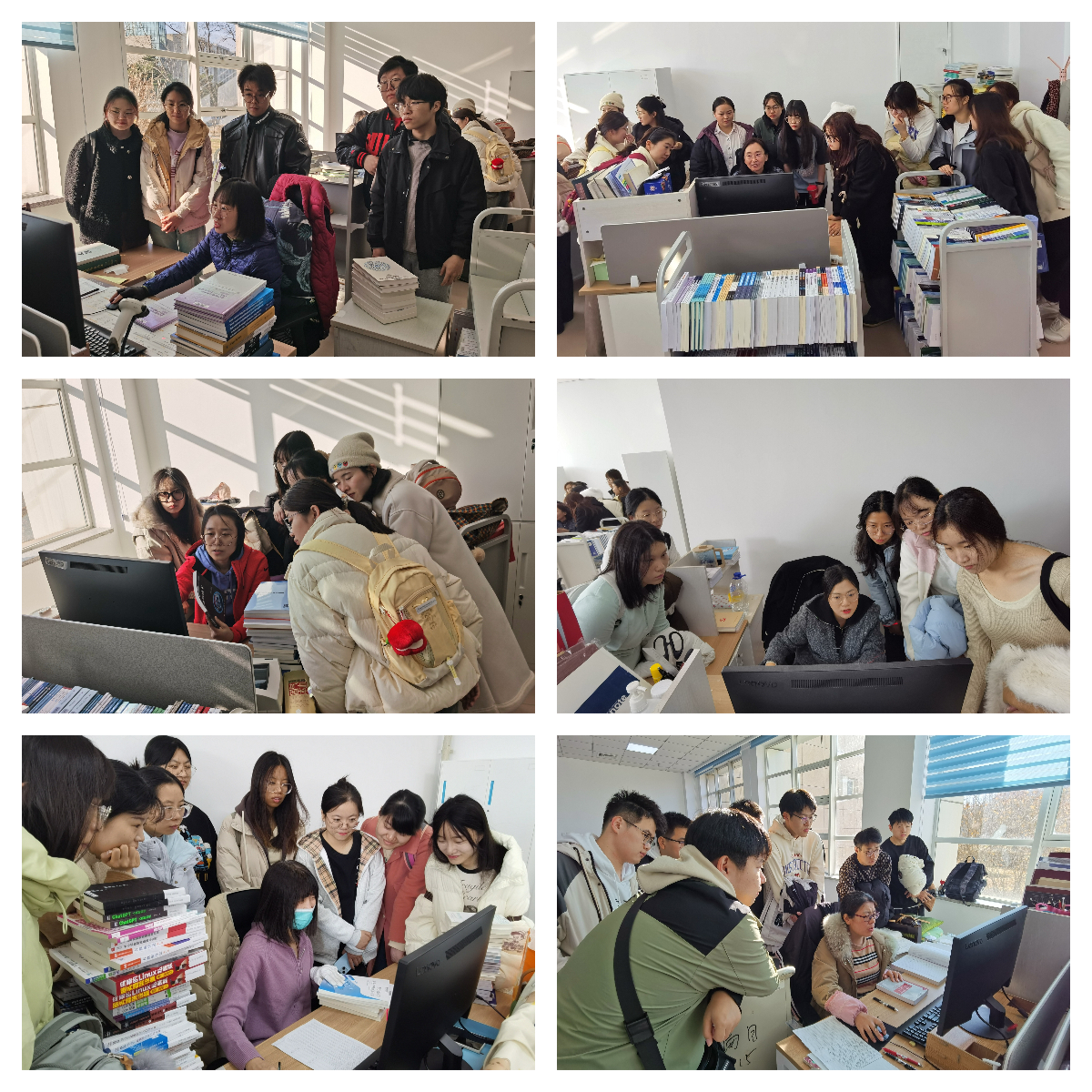 首先,采编部崔红老师向参观师生介绍了图书馆的馆藏情况及图书编目等内容。同学们了解了编目工序及CALIS联合目录馆藏上传的技术要求。同学们积极观摩老师们电脑上的编目界面,认真了解编目数据里重要字段的含义、如何依照《中国图书馆分类法》给新书进行分类、如何获取索书号。伴随着房间内键盘的“嗒嗒”声与扫描枪的“滴滴”声,同学们切身感受到了浓厚的“吉大”书香文化氛围,激发了学生们动手实践的热情,迫不及待想亲自上手体验一下编目工作。随后,同学们自行分组。负责加工、馆藏上传和典藏的几位老师耐心指导同学们进行实操演练。针对学生们提出的问题,崔红老师、向红梅老师、文淑花老师、何雨蓉老师、刘雪婷老师和位红老师做出了细致解答。在采编部多位老师的指导下,同学们集体实践了图书编目和典藏等方面的业务内容,收获满满。