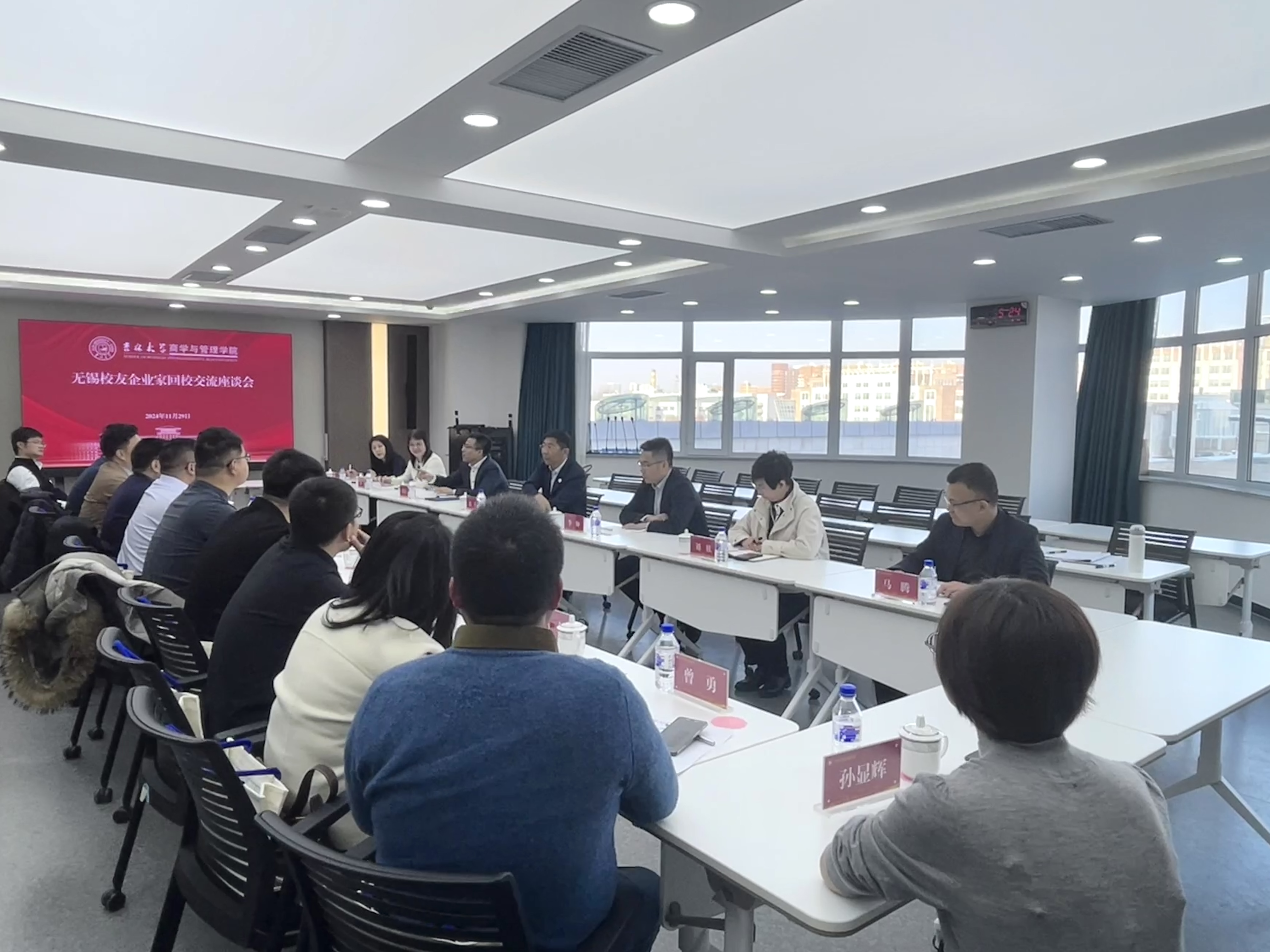 在东荣A506会议室举办无锡校友企业家回校交流座谈会,邀请多位杰出校友共同探讨学科建设、职业发展与合作创新的未来方向,旨在通过资源校友整合,助力学院人才培养与学科发展。无锡校友会会长潘立刚校友、秘书长李艳华校友等12位校友企业家代表以及学院党委书记赵军、党委副书记兼副院长李帅、党委副书记马腾、行政副院长刘欣、MBA教育中心主任兼探花