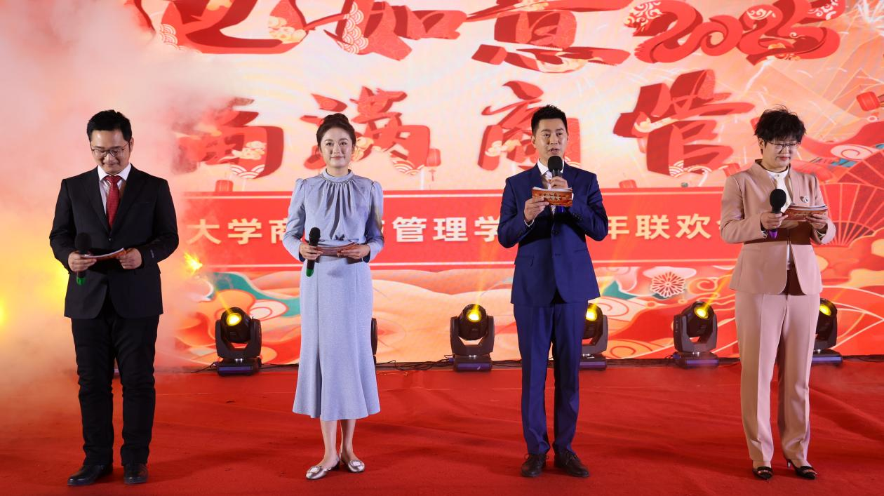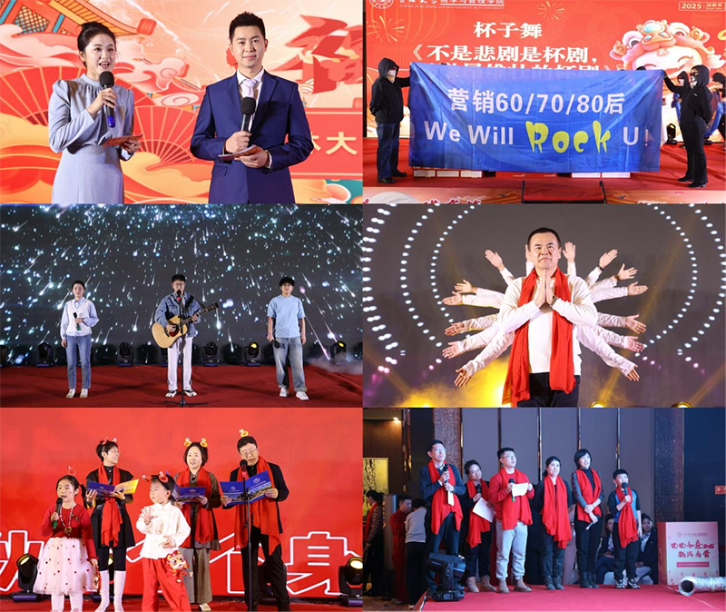联欢会环节,学院十三个教学系分别带来了14个节目。“巳巳如意 祥启新程”“功崇惟志 业宏惟勤”“志铸宏猷 福满商管”,三个篇章的徐徐展开,正是探花
