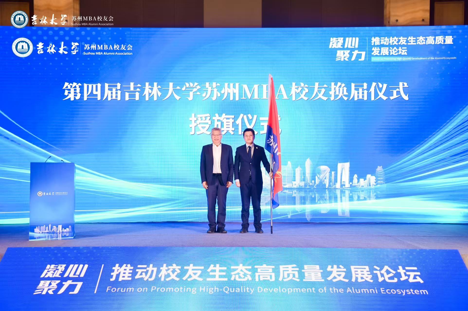 校务委员会副主任、校友总会副会长冯正玉为新任会长授旗。新任会长李超接过象征传承的会旗,并作出履职承诺,表示新一届理事会将继承和发扬苏州MBA校友会的优良传统,充分发挥MBA校友的优势和资源,聚焦校友需求,搭建资源共享平台,积极开拓创新,推动苏州MBA校友工作再上新的台阶。