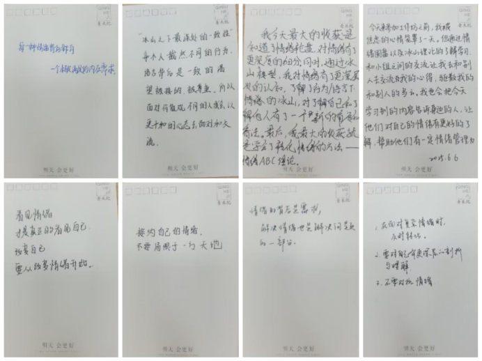 在“情绪转化”环节,王老师介绍了“情绪ABC理论”和正念两个方法。参与者以四人小组为单位,针对焦虑、烦躁等挑战性情绪,通过“四步提问法”解构触发事件(A)、检视信念系统(B)、重构情绪反应(C)。活动尾声通过正念呼吸练习强化情绪接纳能力,并以手写收获明信片沉淀洞见。结束后,同学们对此次工作坊给予了高度评价,并表示迫不及待地想把今天的收获分享给朋友和父母。