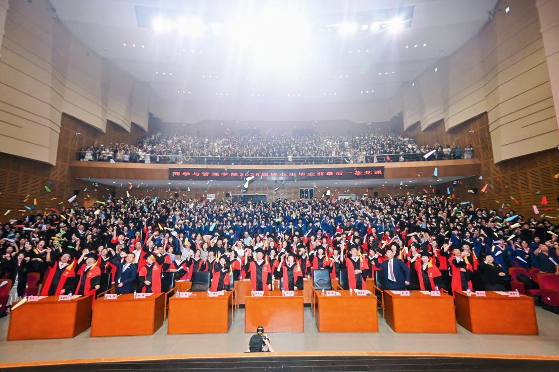 淬炼的专业学识与不屈勇气,蕴含着师长们的殷殷嘱托与母校的深深祝福,铭刻着青年学子永不褪色的奋斗印记。 随着赵军书记一句“放飞吧!”的口令,千余架纸飞机承载着青春的理想与时代的重托,从会场各处腾空而起,划出奔向未来的壮丽轨迹。 这不仅是告别时刻的浪漫仪式,更是新时代商管学子将个人理想汇入民族复兴洪流、以青春之我建设青春之中国的生动宣言和出征号角。 这千余架纸飞机飞向的,是无限可能的未来,也是商管人用智慧和汗水在强国建设、民族复兴的赛道上书写辉煌新篇的广阔天地!