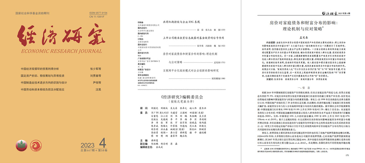 孟宪春副教授在《经济研究》2023年第4期发表题为《房价对家庭债务和财富分布的影响:理论机制与应对策略》文章,这也是我校哲学社会科学资深教授张屹山研究团队的最新成果。该文基于当前住房和房贷分别是中国家庭资产和负债主要构成的现实背景,探索了房价影响家庭债务和财富分布的理论机制,并在此基础上给出促进房价与家庭债务和财富分布之间形成良性互动关系的政策设计。