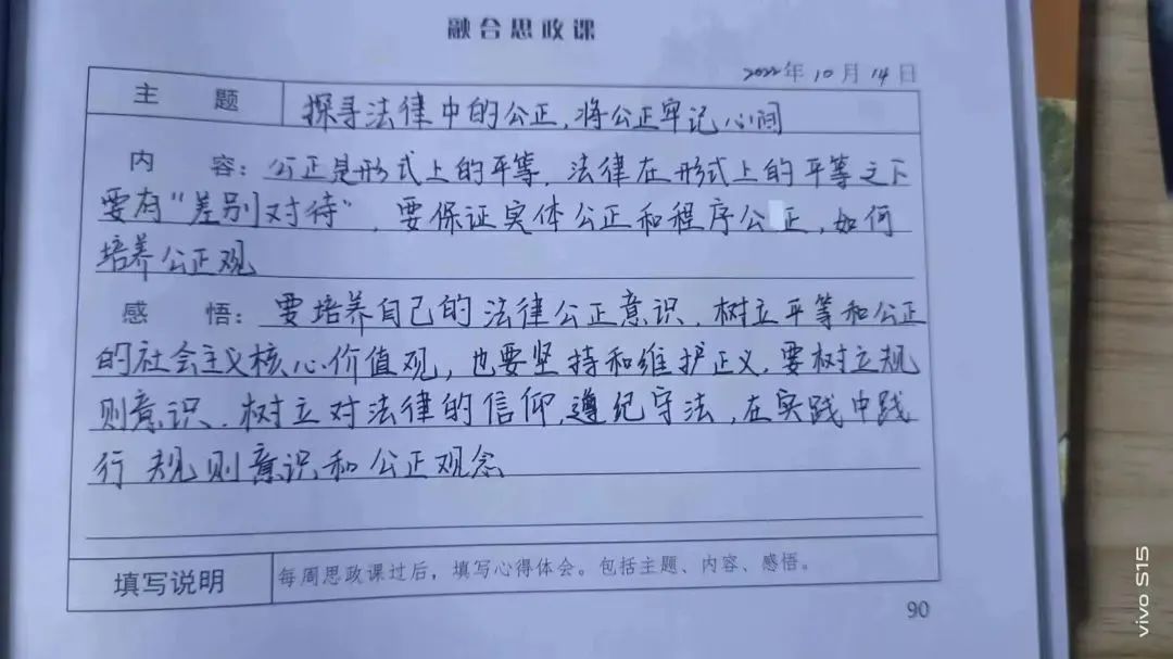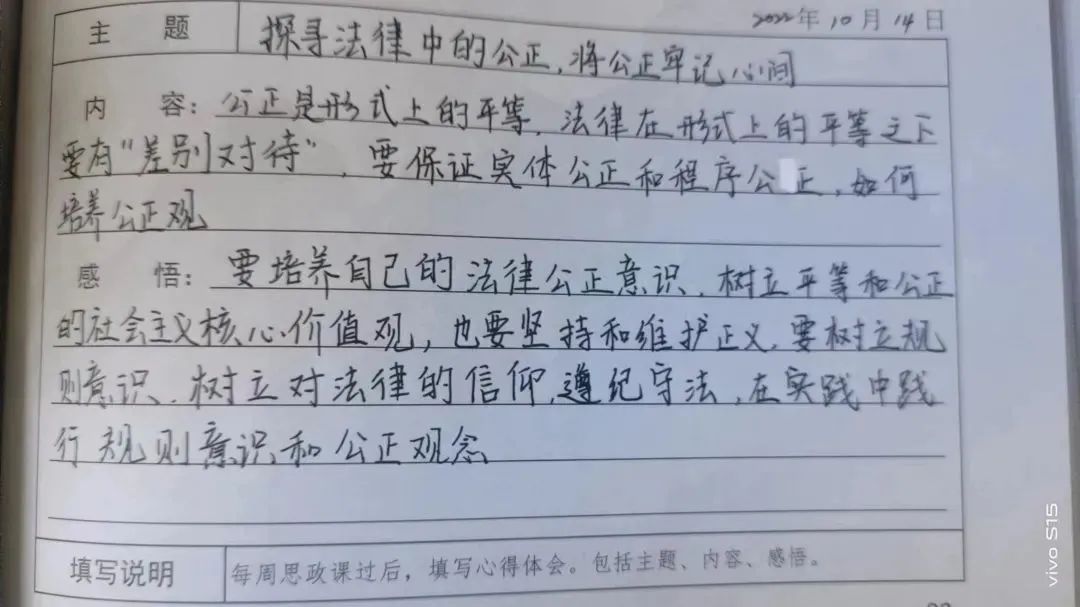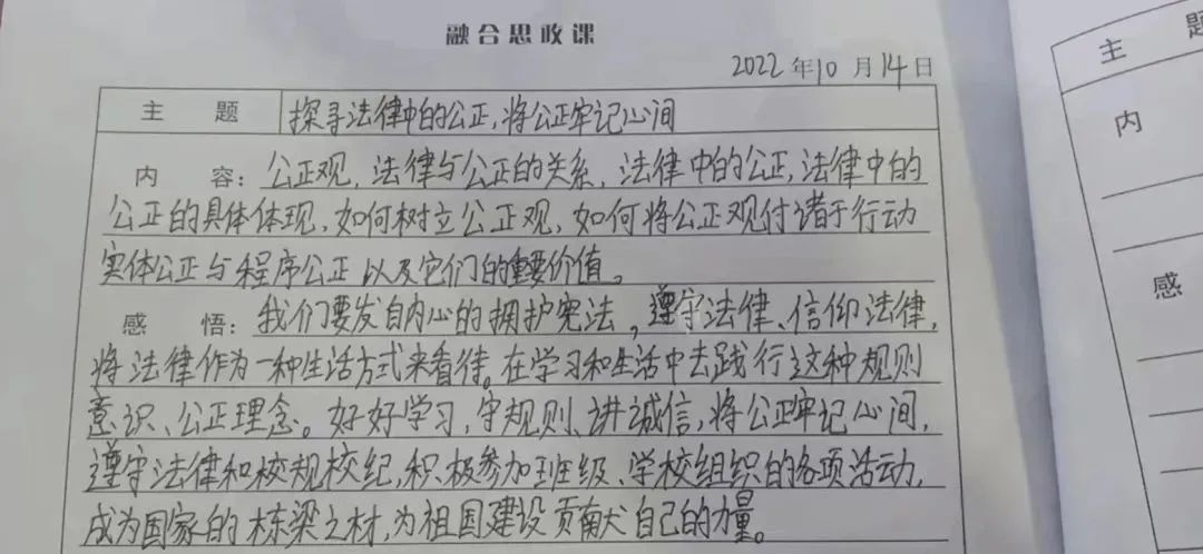 学生们都听得很认真,边听边做笔记,对法律和公正有了更多的理解,并记录了学习感悟。