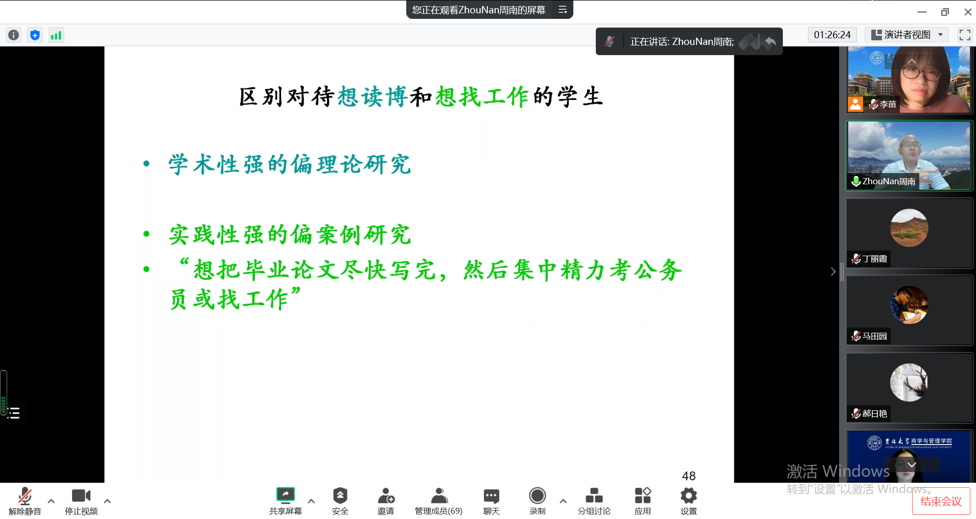 近年来,周教授致力于用《道德经》来诠释现代品牌营销和人生之道,由北京大学出版社先后出版《要钱还是要命:<道德经>的启示》(2012)、《佛光山的星巴克:<道德经>的启示》(2015)、《登山观海:146位管理学研究者的求索心路》( 2016)、《学问人生:<道德经>的启示》(2018)、《千山万水:<道德经>的启示》(2020)等随笔集。在本次报告中,周教授结合自身以及数位国内知名教师的经验,讲述培养研究生的方法和技巧,分析博士生的心理状态并分享自己的育人心得。最后,周教授从阴阳的视角将研究生作学文的过程分为不同的阶段,提出学生和导师在合作的过程中要分别做到两个善于:学生要善于展示和报告、善于沟通;导师要做到善于安排时间、善解人意。