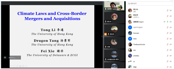 第一场讲座的主题为“绿色金融的监管规范、市场发展和学术研究”。汤教授首先介绍了近期各国面临的主要问题,继而引出中国对气候问题的关注。紧接着,汤教授列举了全球主要国家纷纷提高对ESG重视程度的实例,以及ESG在各国的最新发展近况。最后汤教授为师生汇报了他近期完成的论文“Climate Laws and Cross-Border Mergers and Acquisitions”。讲座结束,汤教授与参会师生进行了深度互动,围绕“碳中和与经济增长”、“ESG评价指标的选取”等问题展开交流。