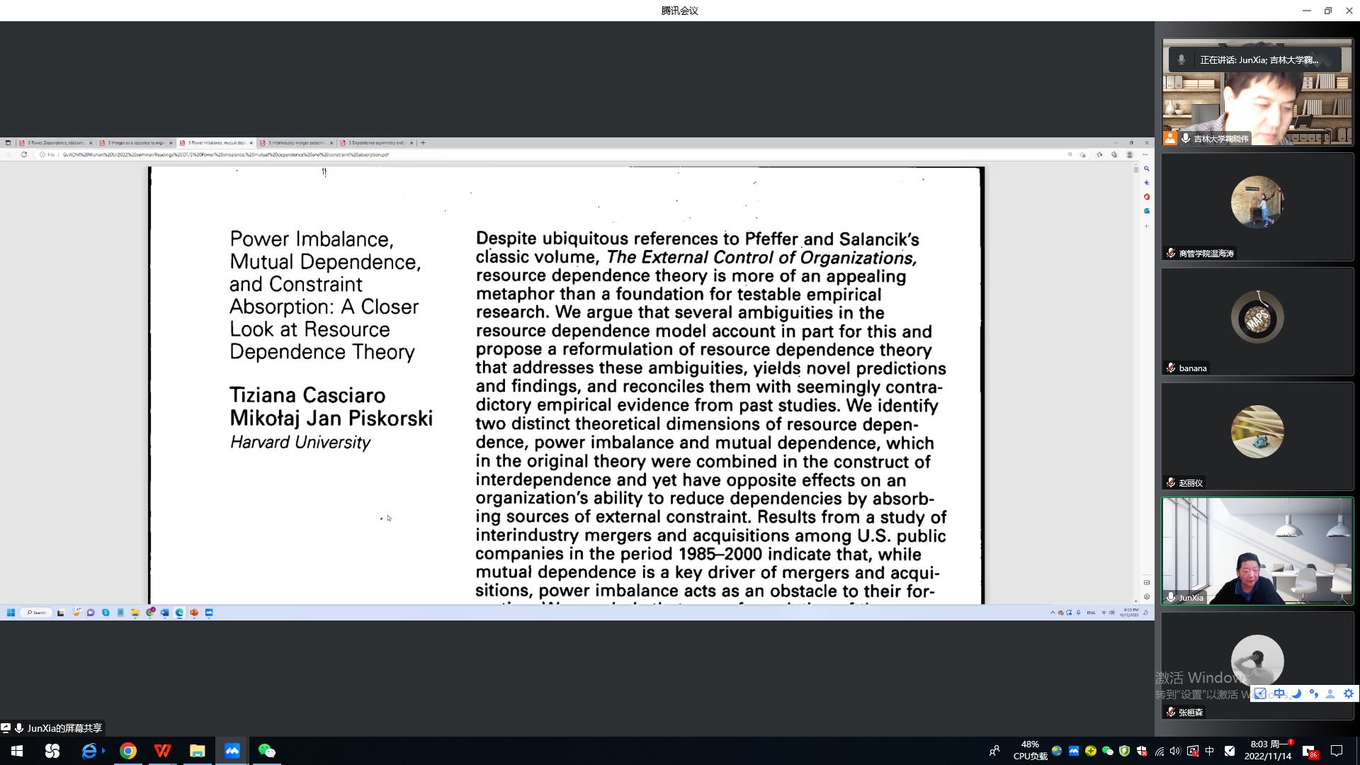 第二场讲座题目为“Power”。夏教授介绍了理论的两种表达方式:即数学语言、讲故事,以及理论的三个层次、四个严谨的方面。理论是对观察到的现象的因果关系的解释。理论需要 Assumption、Deviation和Prediction。如果写文章,最可能做到的就是去“攻击”其他文章的 assumption。夏老师以自己的文章为例讲解了如何针对其他论文的假设进行“攻击”写作论文,如stakeholder signal,并作为文章的贡献。另一篇文章是 structural holes 与 power、信任结合的例子。在美国,Power会使得员工得到提拔,但在中国却是一个负的结果。同样的研究内容,但在不同国家,结果是不一样的。原因在于 assumption不一样。最后,老师和同学们针对讲座内容提出了一个倒“U型”与线性调节的问题,夏老师给予了耐心的解答和详细的讲解。本次讲座极大地开阔了同学们的科研视野,得到了在场师生的一致好评。