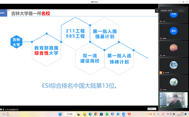 1月17日晚21:10——21:40,“沂起来吉大队”四人在临沂商城实验学校宣讲分会场2分别从吉大是一所什么样的大学、在吉大的学习生活、在吉大的日常生活以及吉大学子未来的发展四个方面展开宣讲,并热情地讲述了自己高三学习的经验,为学弟学妹提供学习、报考新思路,反响热烈,互动激烈。因宣讲学校众多,临沂商城实验学校使用了腾讯会议云录制功能并将其分享至高三班级群内,方便同学与家长随时观看回放,提升了宣传力度。至此,本次宣讲活动圆满结束。
