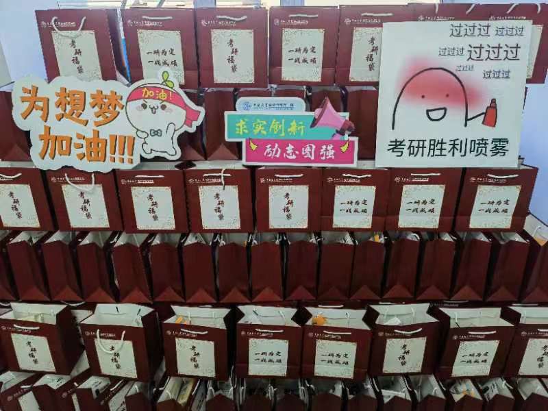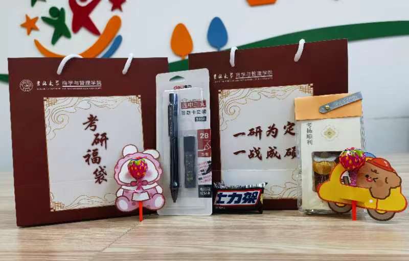 在2023年考研临近之际,还邀请了各领导班子、各系教师、在校学生录制加油视频,为考研学子送上暖心祝福,坚定信心,稳定心态;同时还为近400名考生精心准备了考研福袋,福袋里包含了柿子挂件、巧克力、文具等,象征着“事事如意”、“巧克难题”、“妙笔生花”等美好寓意,希望考研学子承载着学院师生沉甸甸的祝愿,发挥出自己的最佳实力!