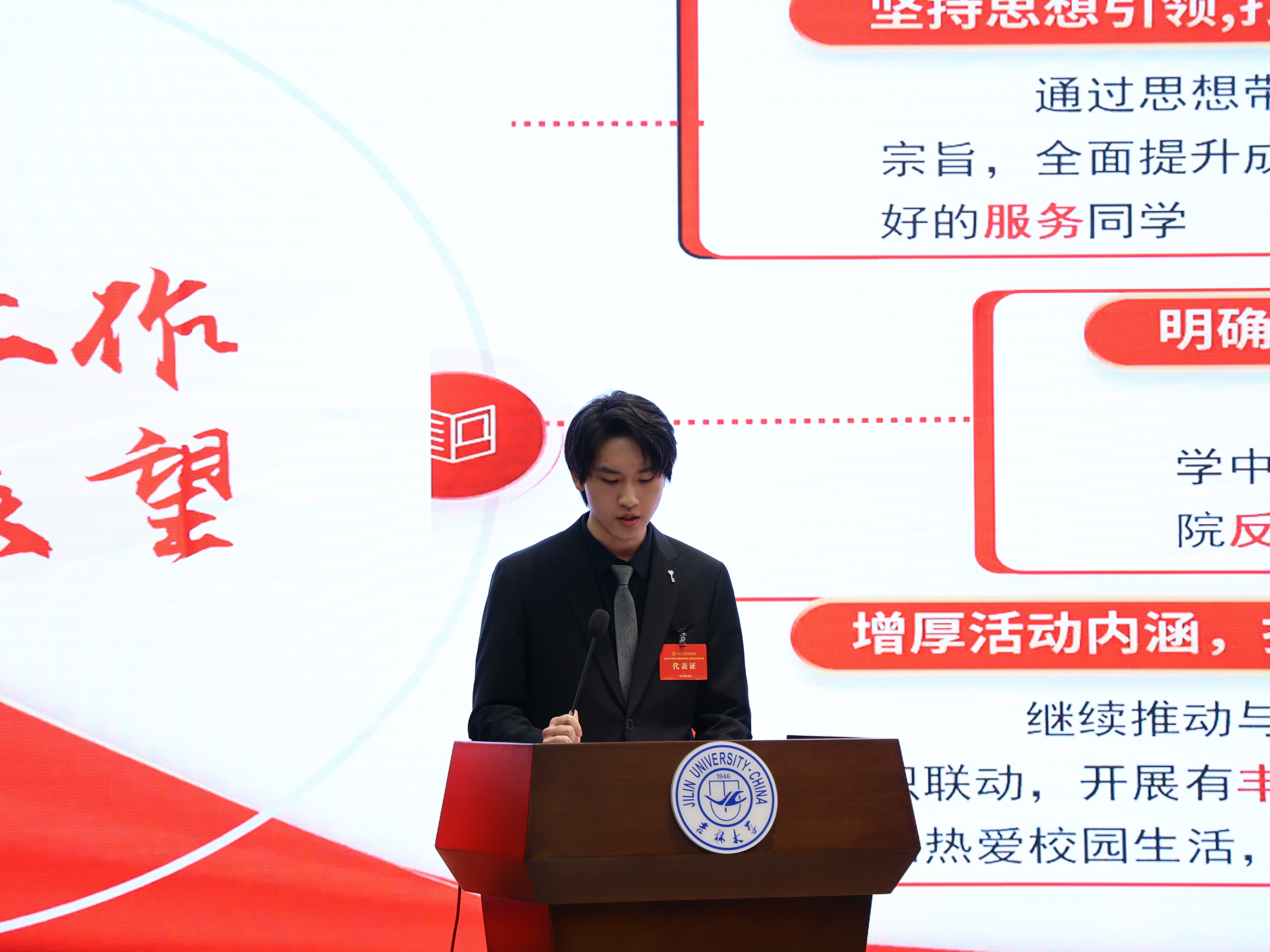 第四届学生会主席团成员。姜鹄代表第四届学生会主席团发言。他代表学生会组织表示,要在未来的工作中踔厉奋发、勇毅前行,以改革创新的理念推动学院学生会发展,以久久为功的信念成为让同学们想得起、用得着、信得过的新时代学生会。
