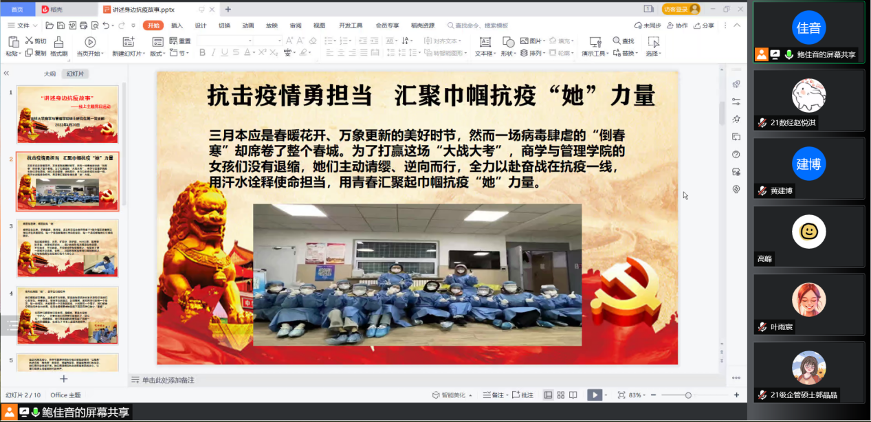 活动的第二部分主要讲述了我们学院甄宓、裴月莹、梁玉芳三位女老师和170名巾帼志愿者的抗疫情故事:为了打赢这场“大战大考”,探花