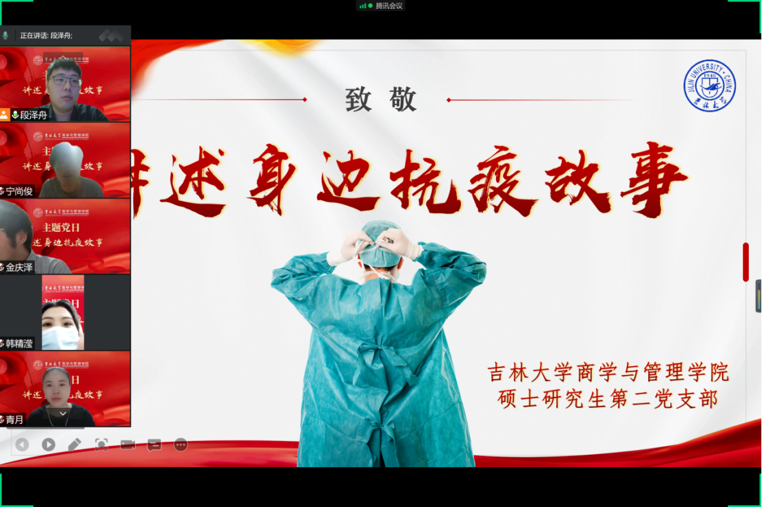 为进深入学习黄大年精神,弘扬伟大抗疫精神,大力宣传身边党员和师生在疫情防控工作中的先进事迹、感人故事与崇高精神,不断增强广大党员归属感、荣誉感和使命感,持续培育、挖掘和丰富吉大精神新内涵。5月13日,硕士二支部根据学院党委的统一安排,就“纪念习近平总书记对黄大年同志先进事迹作出重要指示五周年”相关精神进行学习讨论,并开展了“讲述身边抗疫故事”主题党日活动。本次会议由段泽舟主持。