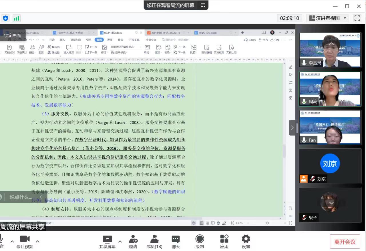 会议开始,2016级博士生刘京以创业者领导力与初创企业战略为主题的学术论文研究和写作思路进行了汇报,2020级博士生刘晶汇报了数字企业价值共创研究的最新进展和框架。随后,李雪灵教授针对每一位学生的汇报从存在问题、解决办法等方面提出意见和建议。参会的吉大商管学院与东北电力大学青年教师也都围绕着学生们的研究议题分别提出了自己的建议和见解。