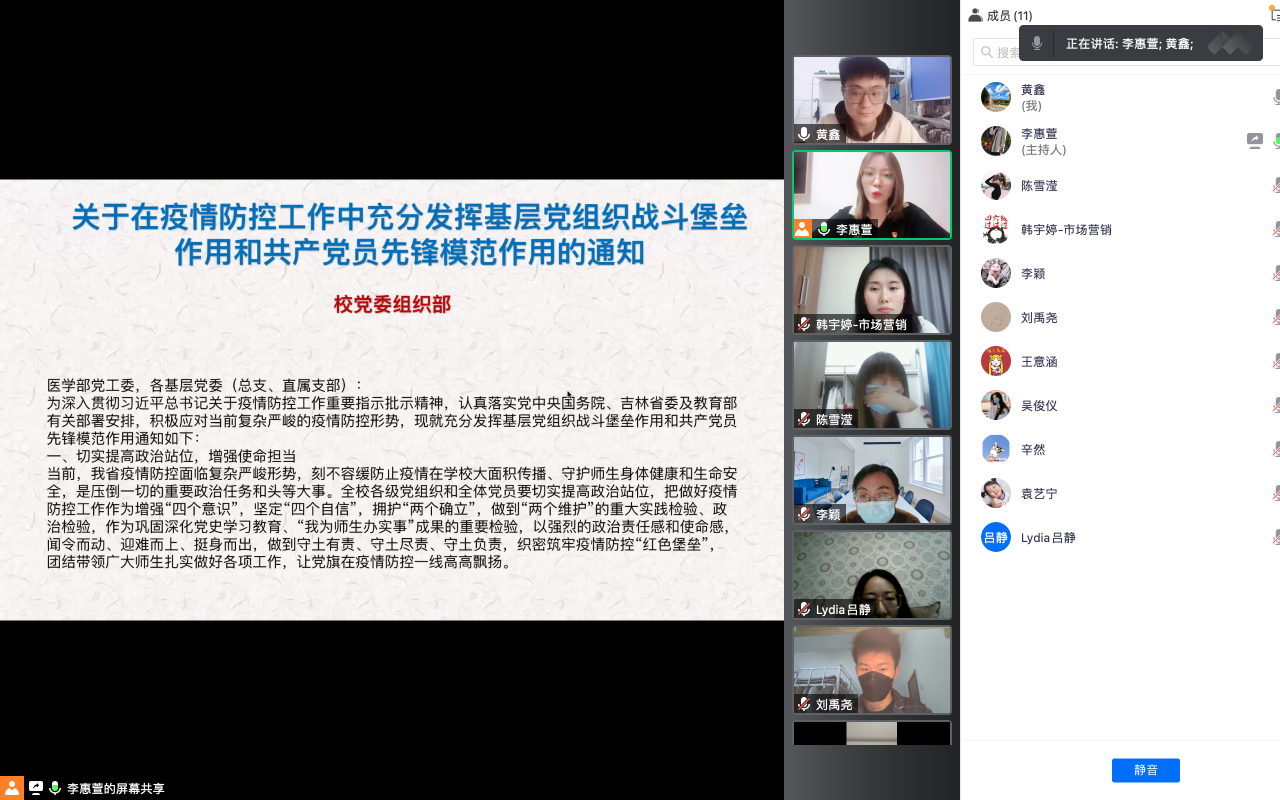 首先,为深入贯彻习近平总书记关于疫情防控工作重要指示批示精神,认真落实党中央国务院、吉林省委及教育部有关部署安排,积极应对当前复杂严峻的疫情防控形势,充分发挥基层党组织战斗堡垒作用和共产党员先锋模范作用,支部书记李惠萱同志宣读了由探花