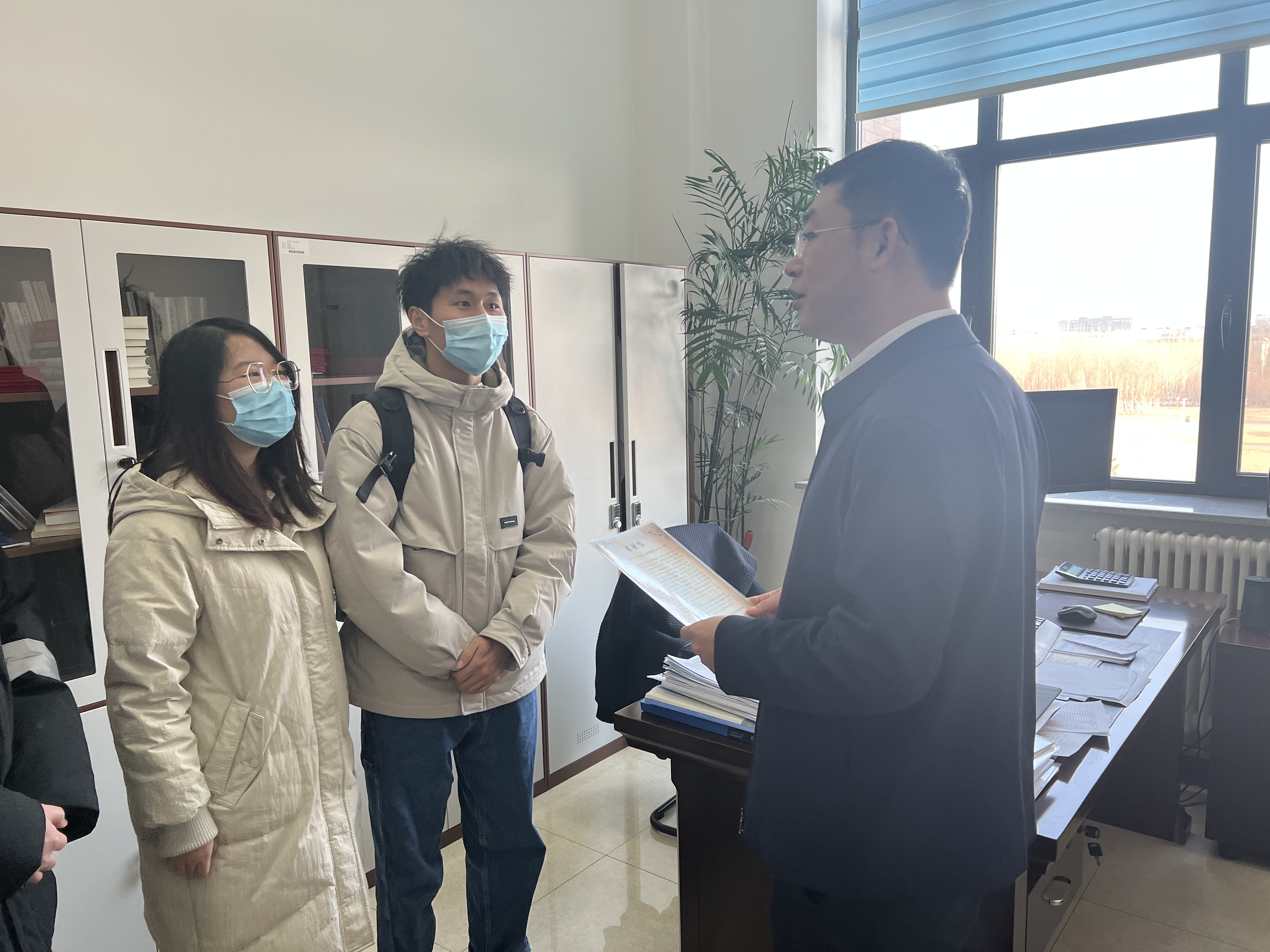 研究生代表马远航同学、张庭赫同学、贾乐同学一行前往鼎新楼,向研究生工作部赵玥部长及相关老师送上感谢信。感谢研究生工作部的各位领导、老师在寝室搬迁过程中对全院师生无微不至的照顾和帮助,研究生寝室搬迁工作进展顺利,师生非常满意。