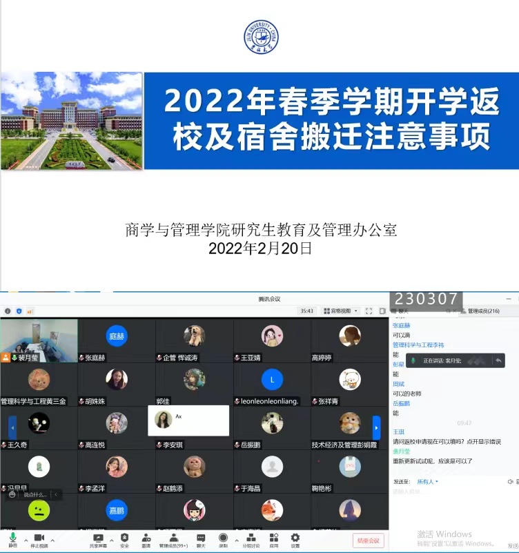 会议最后,裴月莹老师针对各位同学就特殊批次研究生返校和公寓搬迁等内容提出问题进行答疑,老师们和同学们自由交流研究生返校和公寓搬迁事宜。